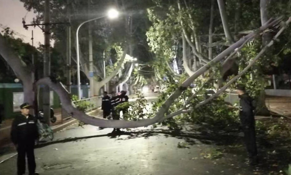 绿化队的抢修人员赶到现场后,忙碌了近三个小时,才将断裂的侧干清除运走,使道路恢复畅通。