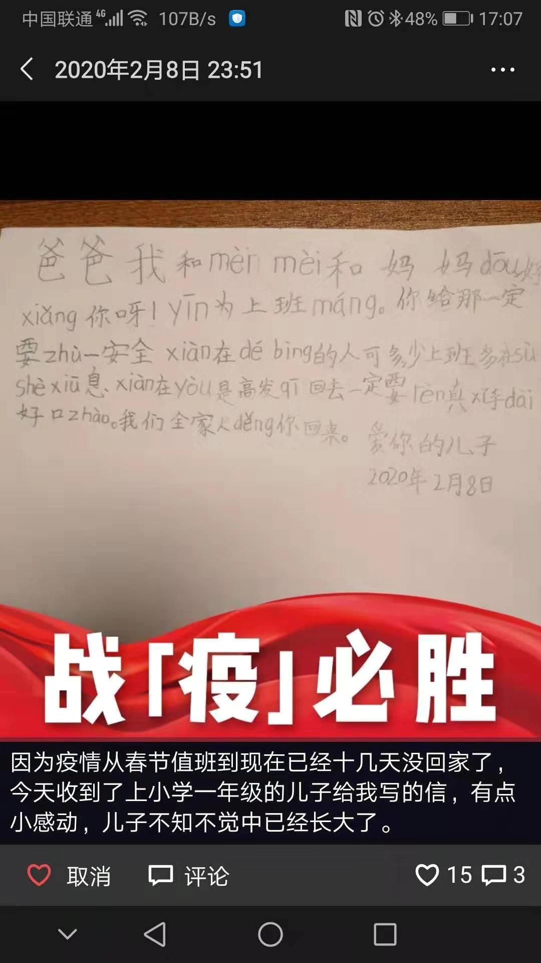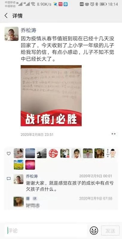 大河报•大河客户端记者从分局交管巡防大队获悉,该大队民警乔松涛近日收到了一封信。他儿子在心中写到:爸爸我和妹妹和妈妈都好想你呀!因为上班忙你一定要注意安全,现在生病的人可多,少上班多在宿舍休息,现在又是高发期,回去一定要认真洗手戴好口罩,我们全家人等你回来。爱你的儿子”。虽然孩子信中的字是用拼音代替的,但是我们依旧能感受到他思念爸爸的心情。据了解,乔松涛从部队转业后在公安工作8年,春节期间除了值班,每一年还有很多不同的大型安保任务,今年更是战斗在了防控疫情的前线,连续10多天没有回家的他们。