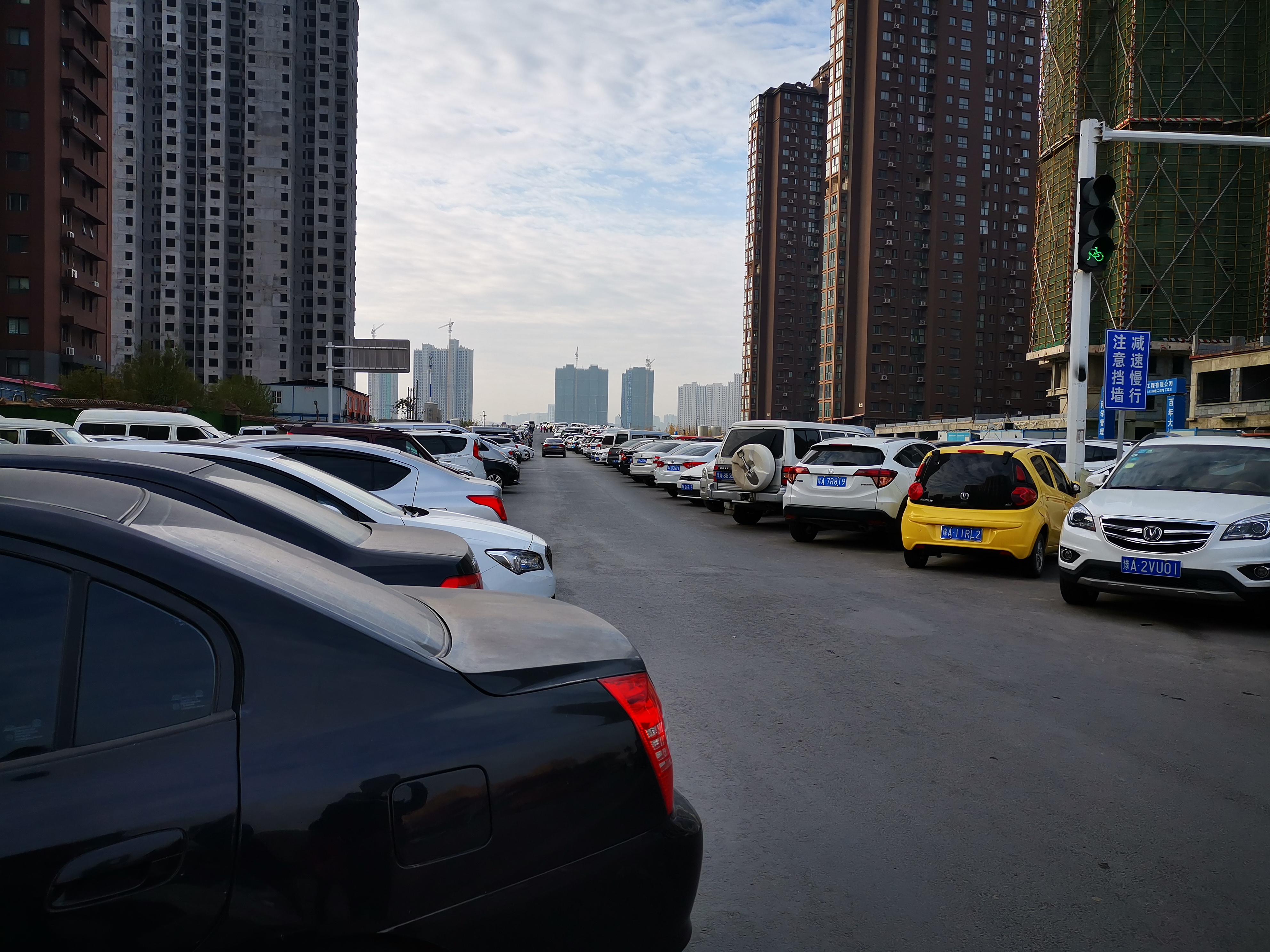 11月20日上午,大河报·大河客户端记者来到碧云路与南屏路交叉口,该路口继续向南即为碧云路跨南水北调大桥。该大桥长约500米,从该路口一直到大桥南侧,这个双向8车道的大桥的东西两半幅上,密密麻麻地一共停了四排私家车。在大桥的东半幅,因两侧被占满,路中间也停上了一排小汽车。而在大桥靠近南侧的一端,荷载16吨重的渣土车和大巴车也停在桥上。