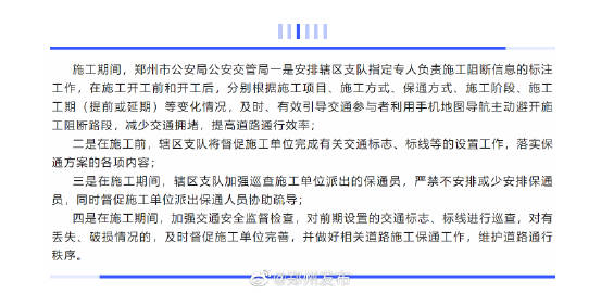 中州大道东幅与金水路立体交叉部位下部结构,设计东侧墩台位于金水路现状中央绿化带内,为保证桩基和承台施工期间来往车辆行车安全,郑州交警将采取以下交通管制和保通措施: