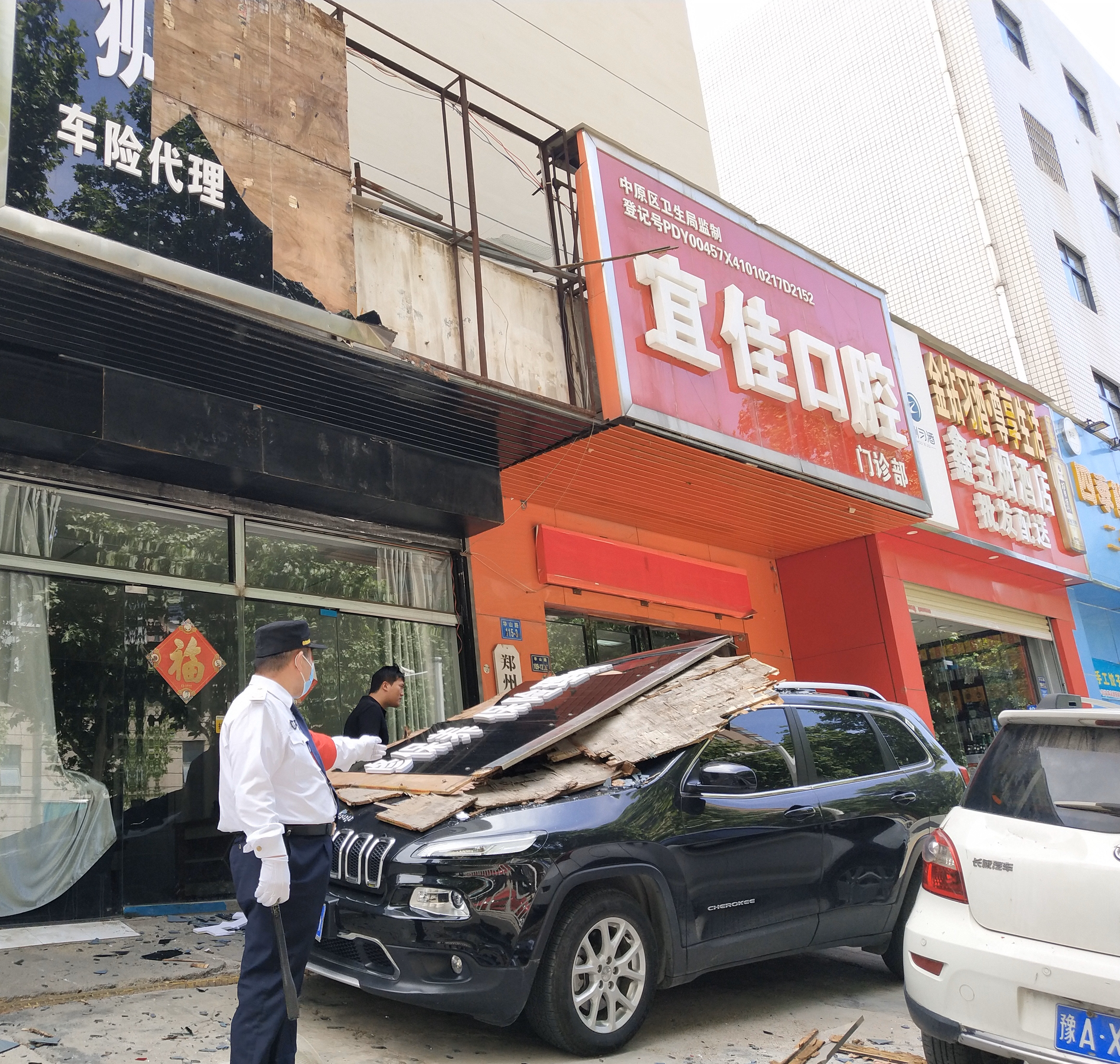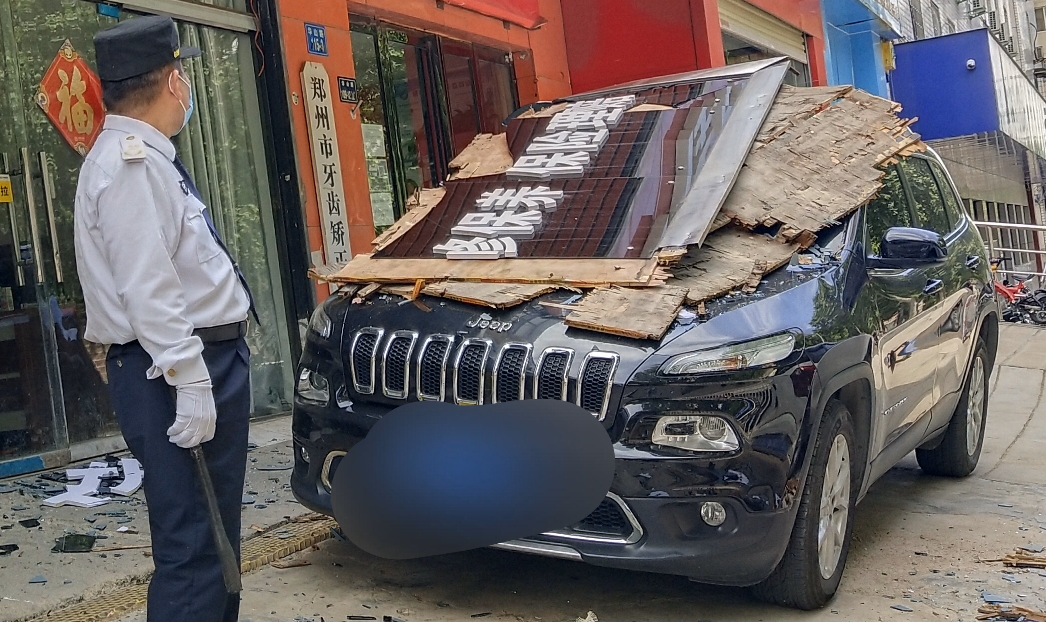 今天上午10时许,郑州市中原区绿东村办事处巡防队员陈和中、冉国岭,巡逻到汝河路与华山路交叉口北约100米处,发现路东一家汽车美容店的门头,被大风吹落了一半,正砸在下面停放的两辆私家车上,其中一辆黑色私家轿车前挡风玻璃和车顶窗玻璃碎裂,另一辆停在门前的白色轿车后备箱盖被击穿多个洞孔。