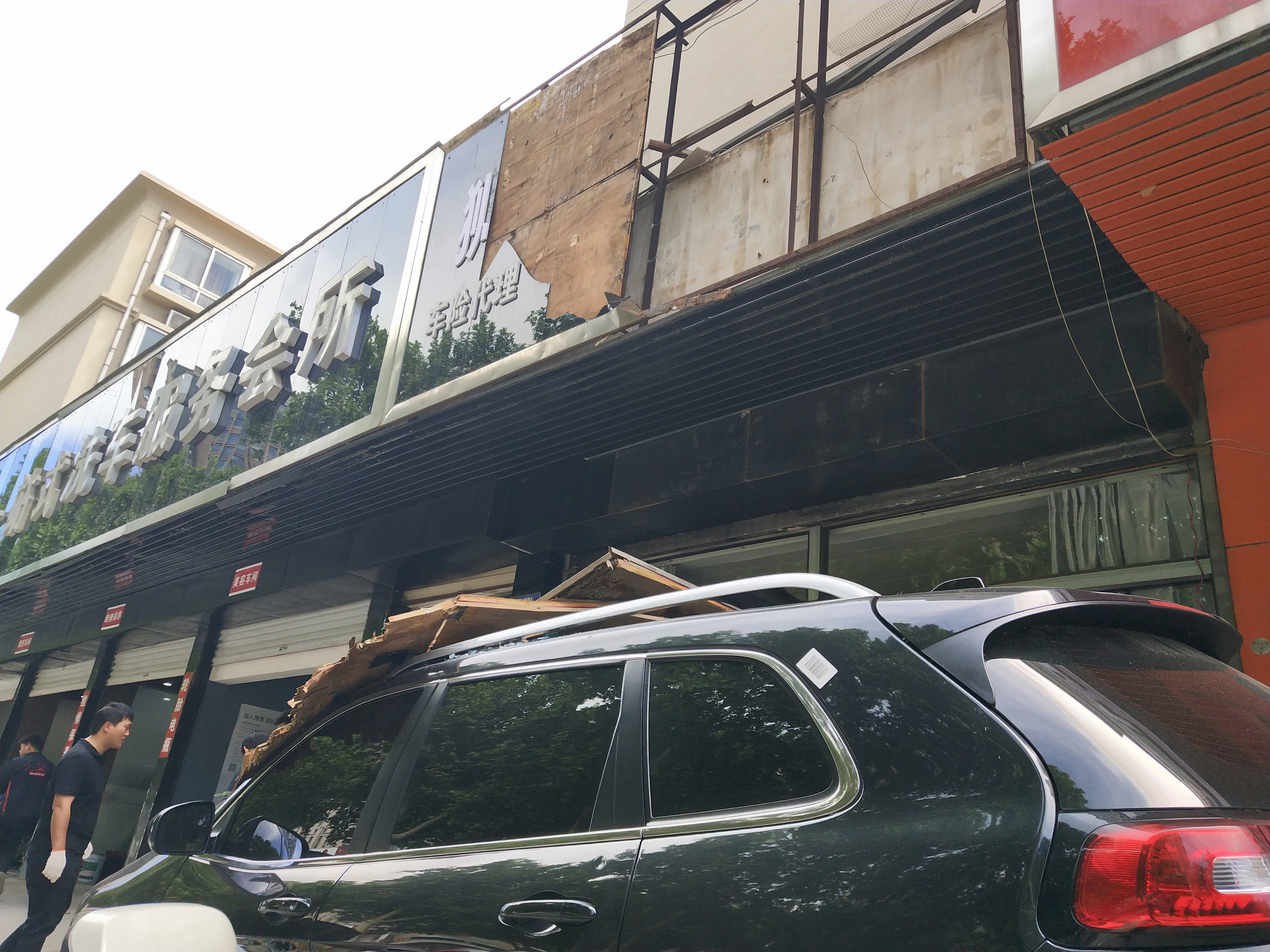 因白色轿车是被自家店的门头砸坏的,店老板表示会一起进行维修。队员提醒广大市民,在极端恶劣天气下,一定要注意安全,最好将私家车停放到安全地带,以免被坠物毁坏。