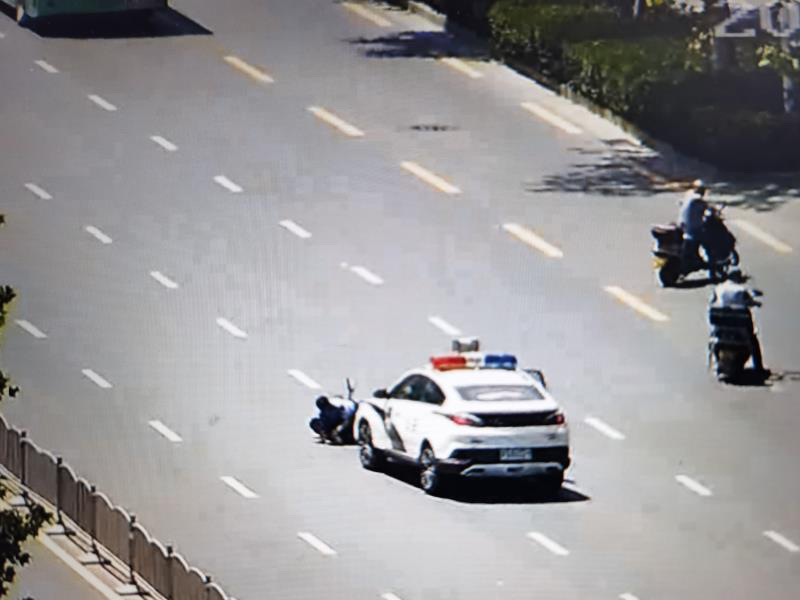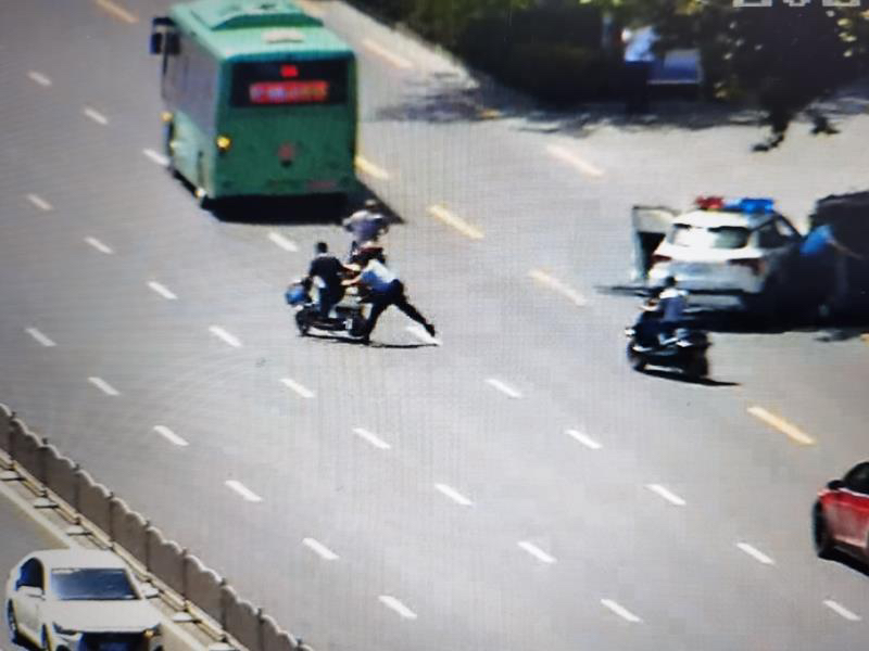 在视频中心“天眼”的指引下,民警郑金勇带领巡防队员李雷一路飞车追踪到航海路与郑密路口西100米处,发现了两名嫌疑人,利用警车逼停了其中一名嫌疑人的电动车,民警迅速上前将一名嫌疑人扑倒在地当场控制,与此同时,增援警力赶到,将另一名嫌疑人抓获,整个过程干净利落,惊呆了路边的群众,纷纷为民警鼓掌称赞。