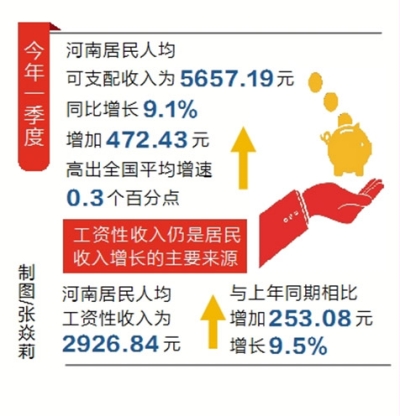 国家统计局河南调查总队有关负责人表示,工资性收入仍是居民收入增长的主要来源。一季度,河南居民人均工资性收入为2926.84元,与上年同期相比增加253.08元,增长9.5%。