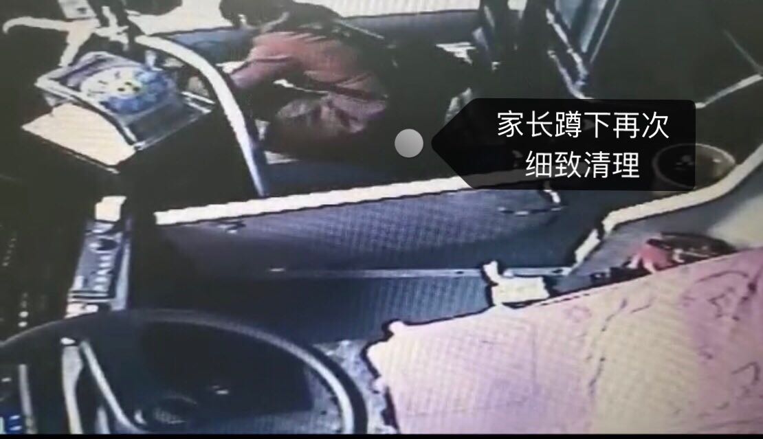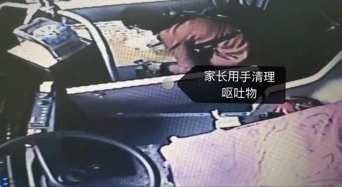 当这位母亲蹲在地板上,用双手认真地将呕吐物一点一点清理出去时,可爱的孩子乖乖地站在前排座椅旁边看着妈妈。