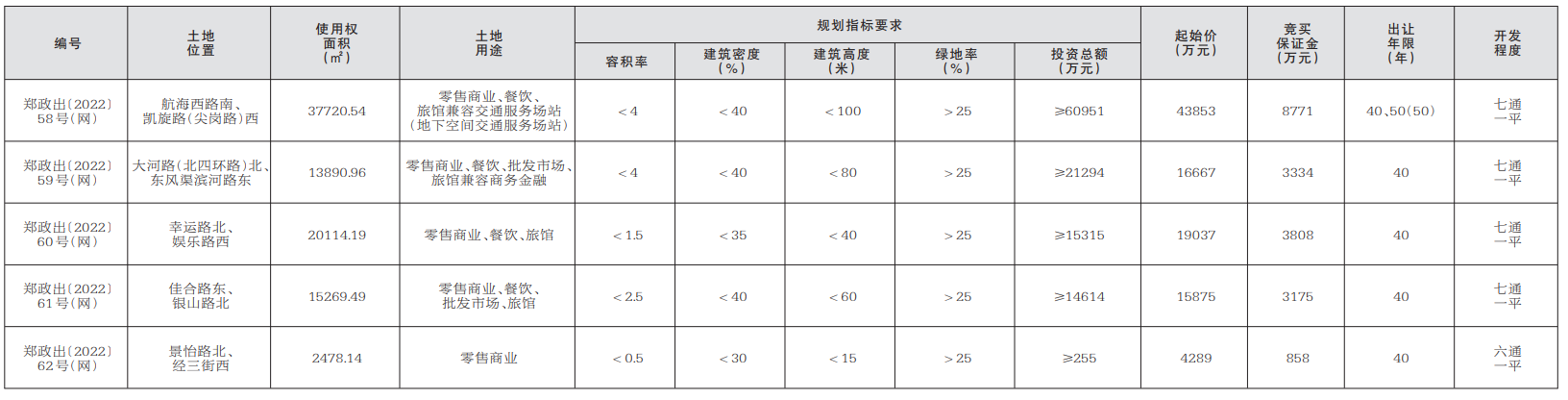 【大河财立方消息】11月25日,郑州市自然资源和规划局决定以网上挂牌方式出让郑政出 〔2022〕58、59、60、61、62号(网)地块的国有建设用地使用权。