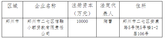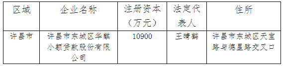 【大河财立方消息】日前,河南省地方金融监督管理局公告,同意取消许昌市东城区华麒小额贷款股份有限公司、郑州市二七区信融小额贷款有限责任公司等2家公司试点资格。