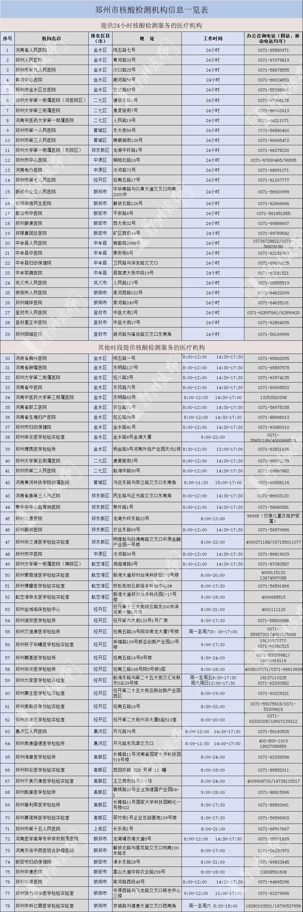 截至目前,郑州市共有78家机构具备核酸检测能力,全市29家综合性医疗机构面向市民提供24小时核酸检测服务。
