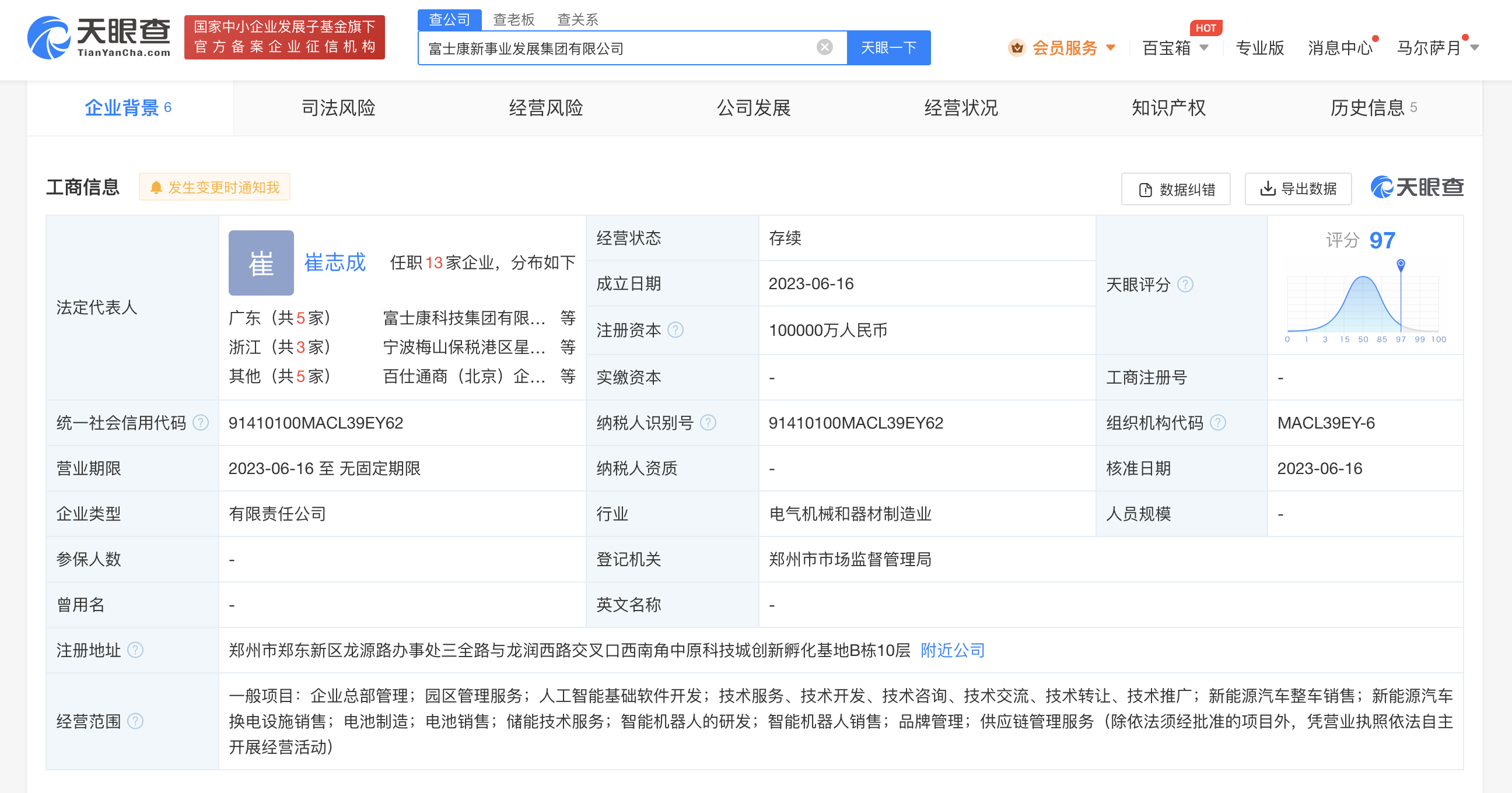 富士康新事业发展集团有限公司经营范围包括企业总部管理、园区管理服务、人工智能基础软件开发、技术服务、新能源汽车整车销售、电池制造、智能机器人的研发等。股东信息显示,该公司由郑州富士康关联公司鸿富锦精密电子(郑州)有限公司全资持股。