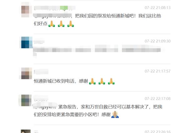 这是7月22日,来自郑州某群聊中的一组对话。当时郑州暴雨刚刚结束,郑州很多小区地下车库被淹,因此断电断水,生活异常不方便。