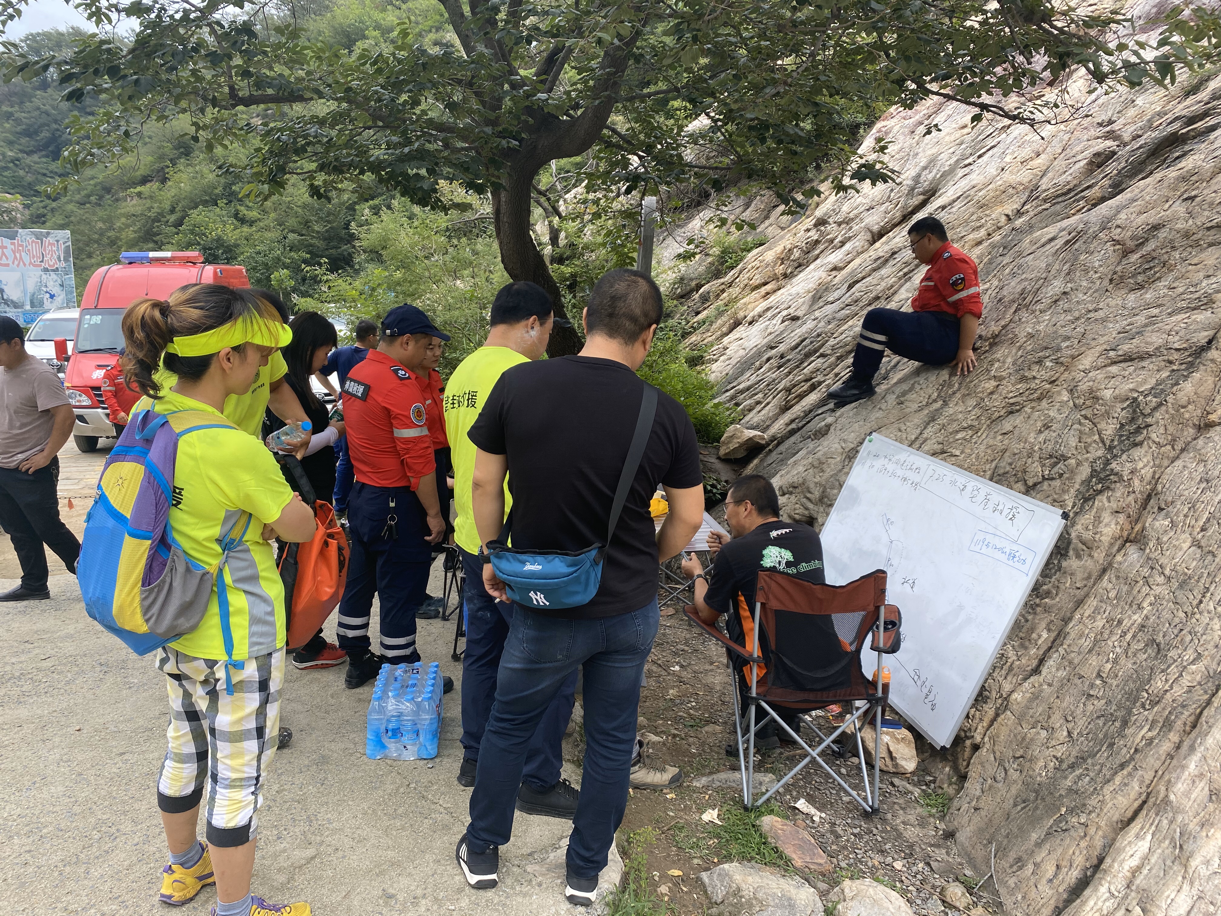 上午11时10分,嵩山消防救援站、中国洞穴救援联盟(CRC)、神鹰救援登封大队、登封户外救援队、登封蓝天救援队的救援人员在玉皇沟停车场集合完毕,开始商议制定营救方案。