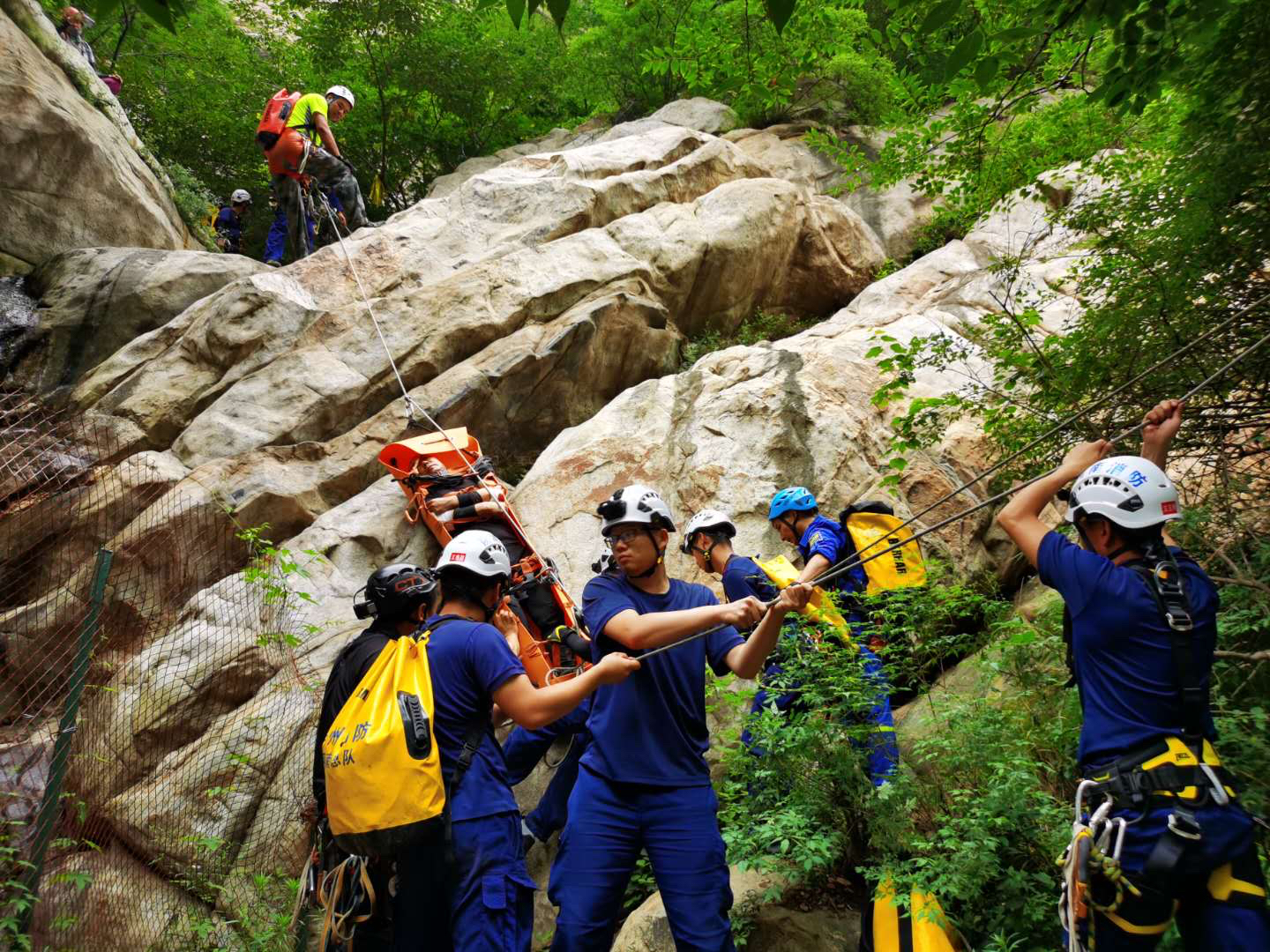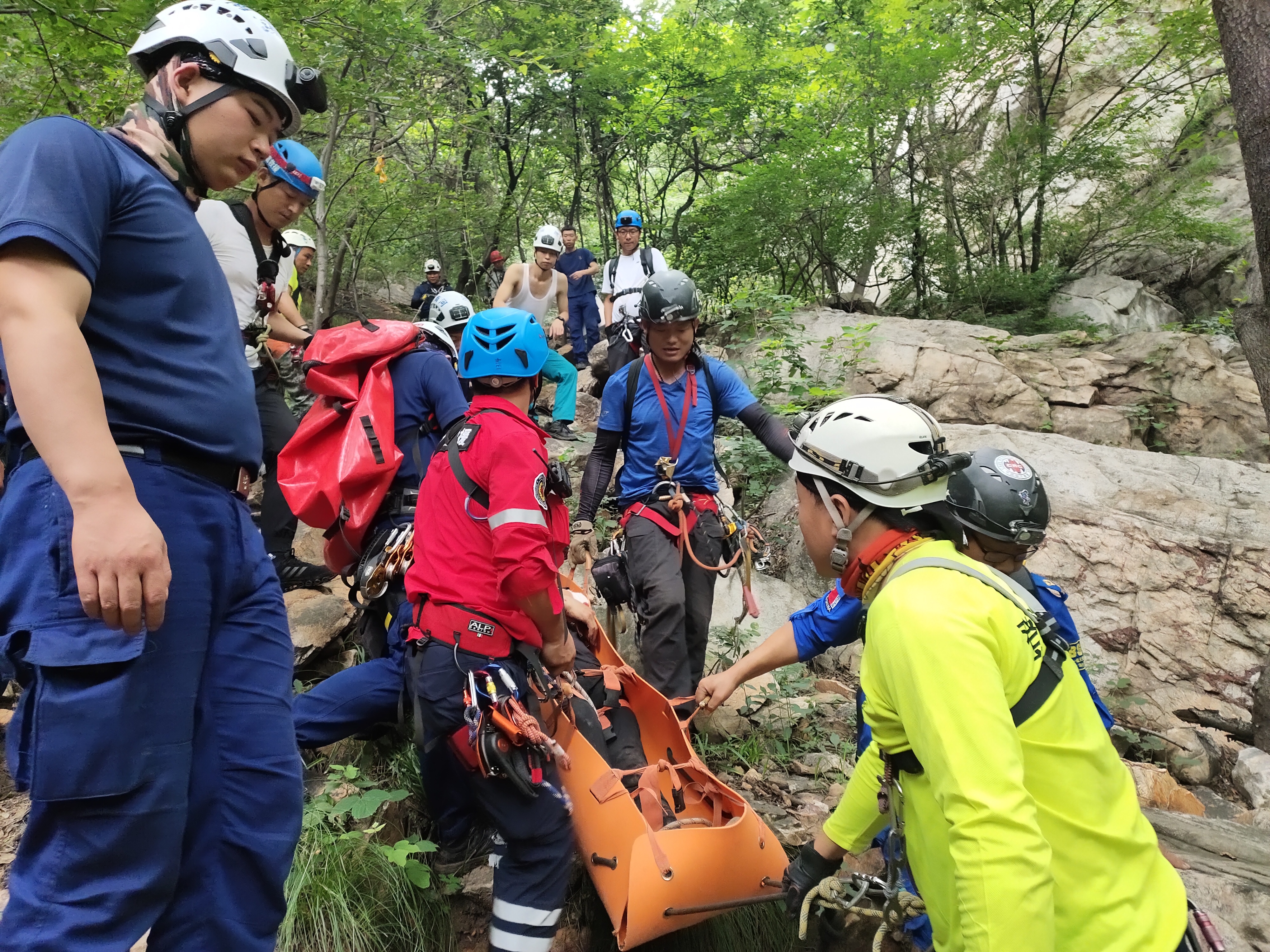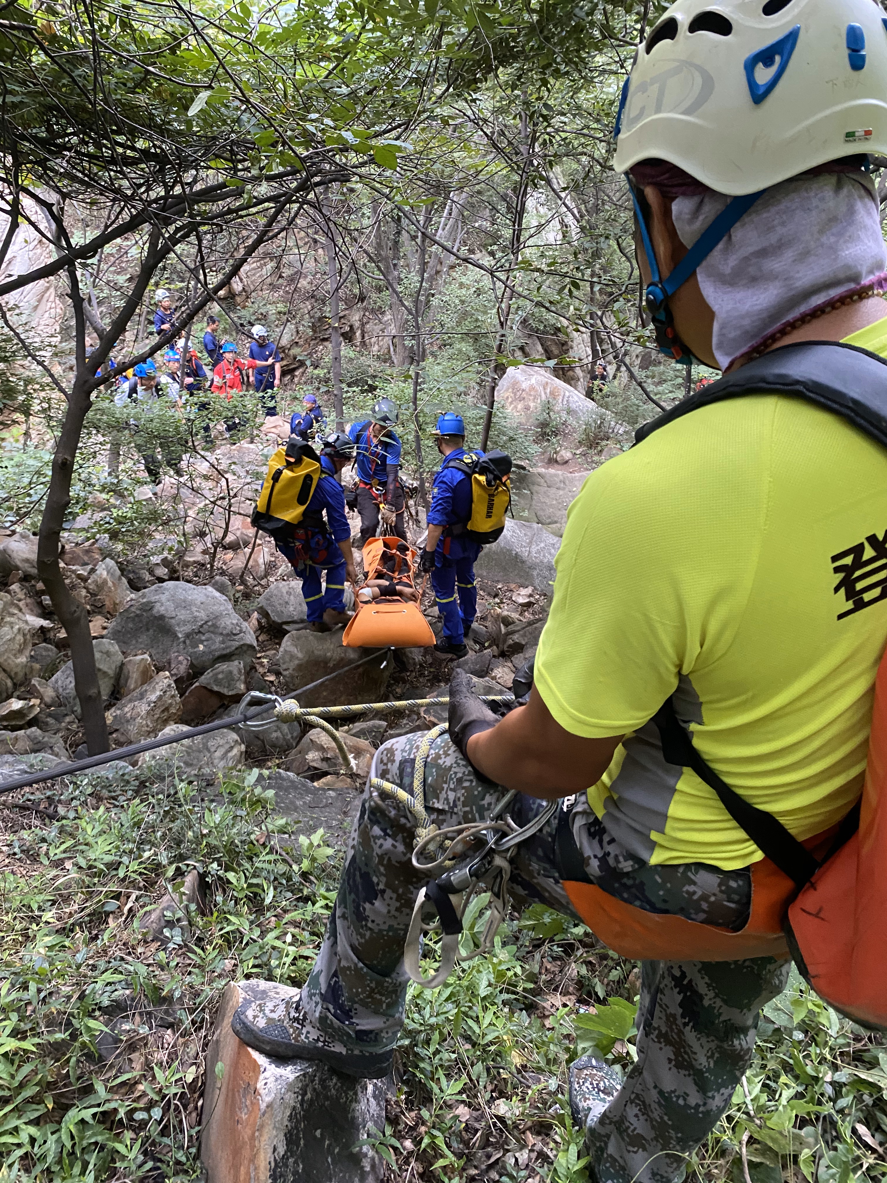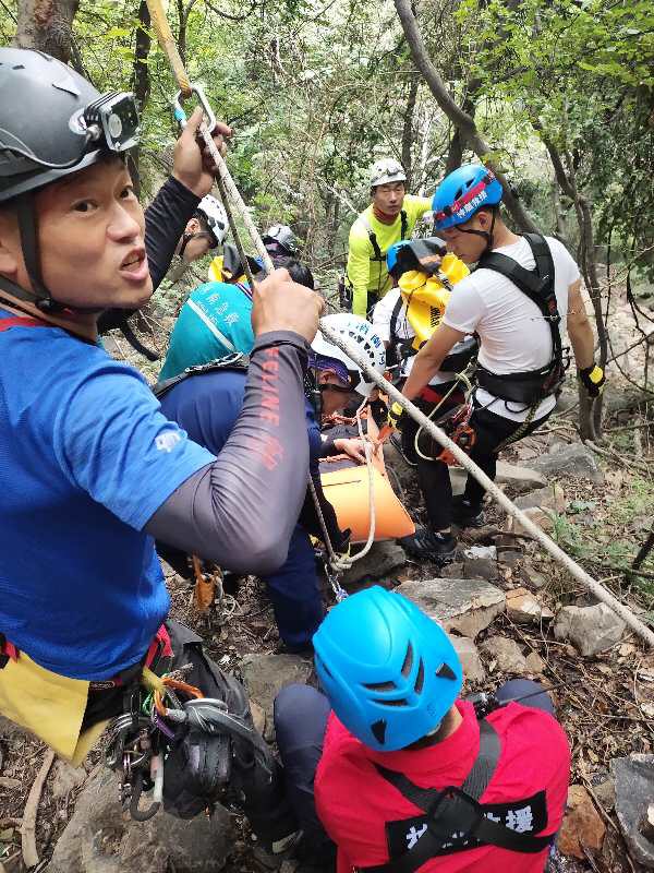 下午1时38分,第一梯队救援人员在明月峰上,见到了坠入北鬼道内的受伤人员张先生。此时,张先生虽然身上多处受伤,但神清醒。救援队员们用聊天、问询的方式,结伤者张先生进行了简单的沟通和伤情的评估,并上报前线指挥部。随行的120急救医生,对张先生的伤情进行了初步检查,认为张先生身上有多处骨折。根据医生建议,救援人员将张先生固定在担架上,开始向悬崖上提拉。