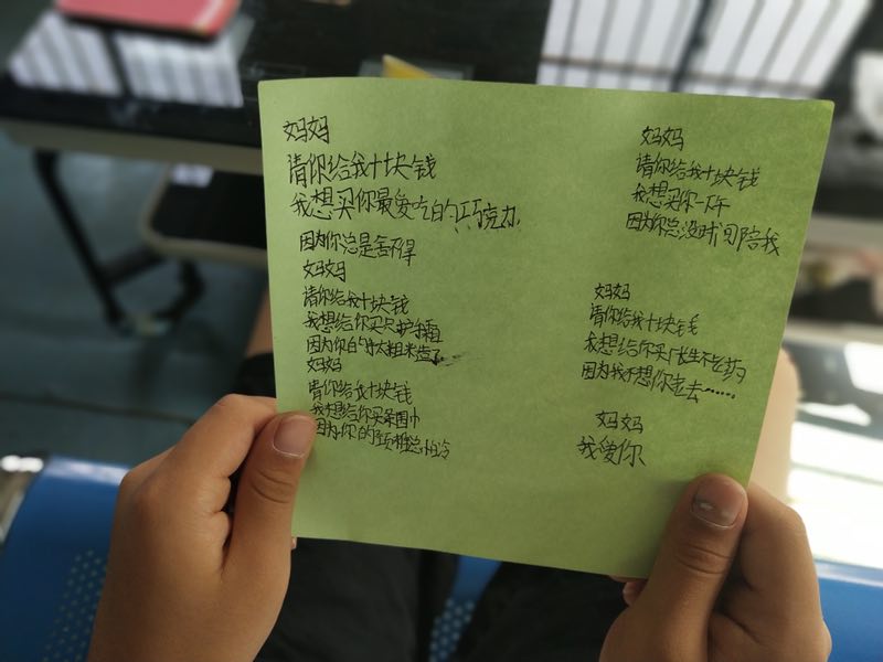 可是早上起床后,小男孩发现妈妈已经上班走了,妈妈晚上八点左右才能下班,而他下午五点钟就要返校了,等到下周回来时教师节也过去了,所以趁返校之前想给妈妈一个惊喜,想大声说一句:“妈妈你辛苦了!我爱你!”