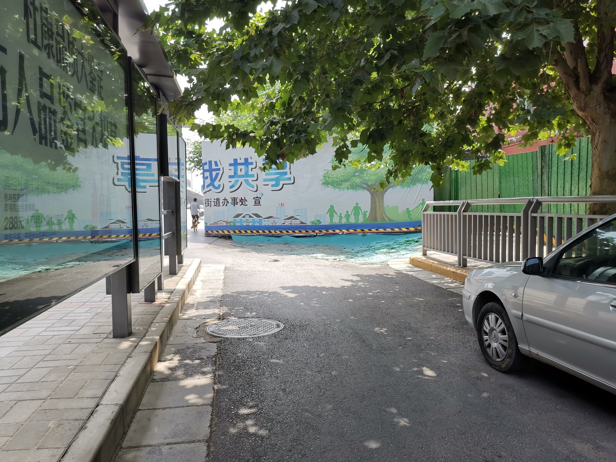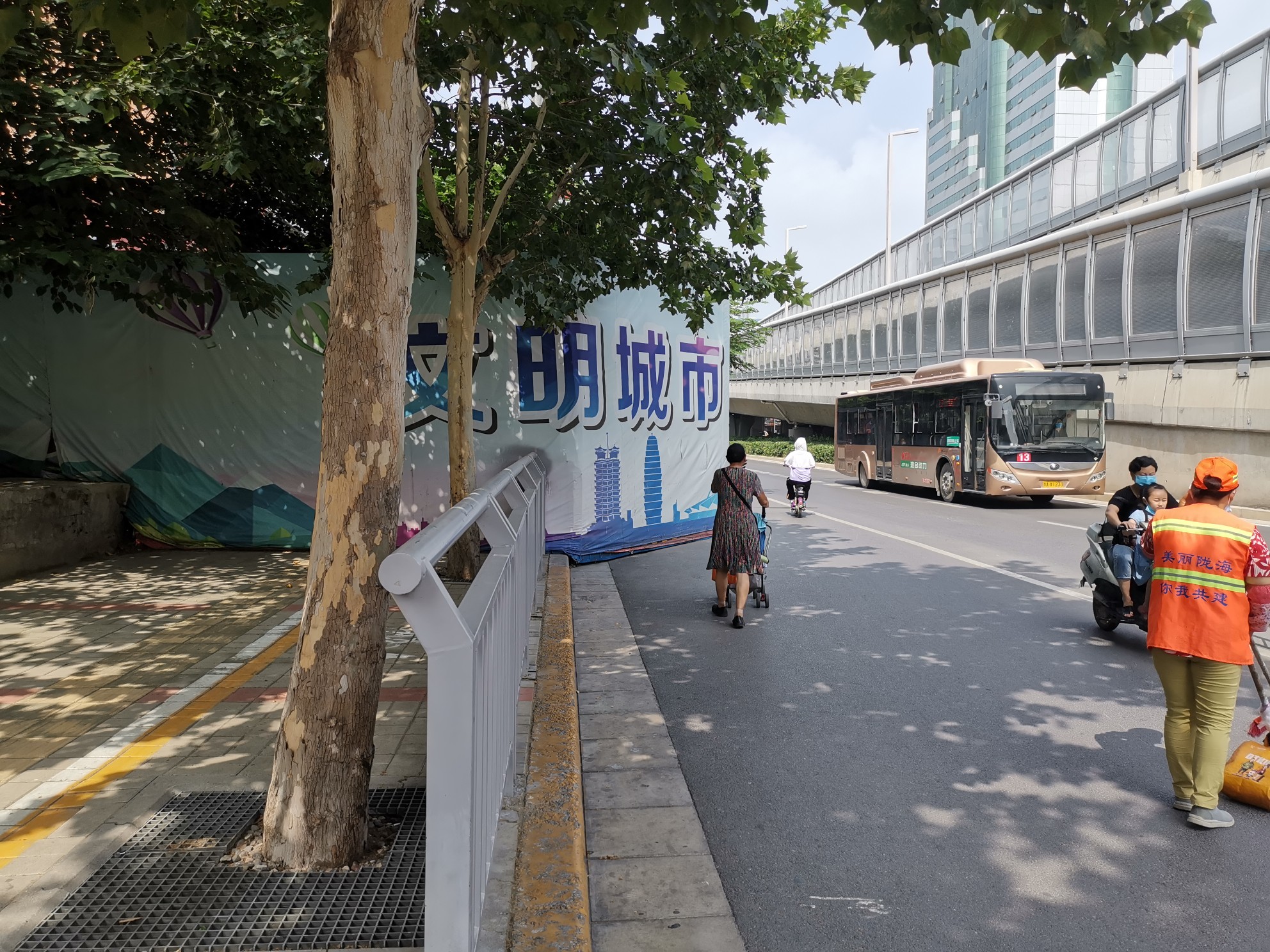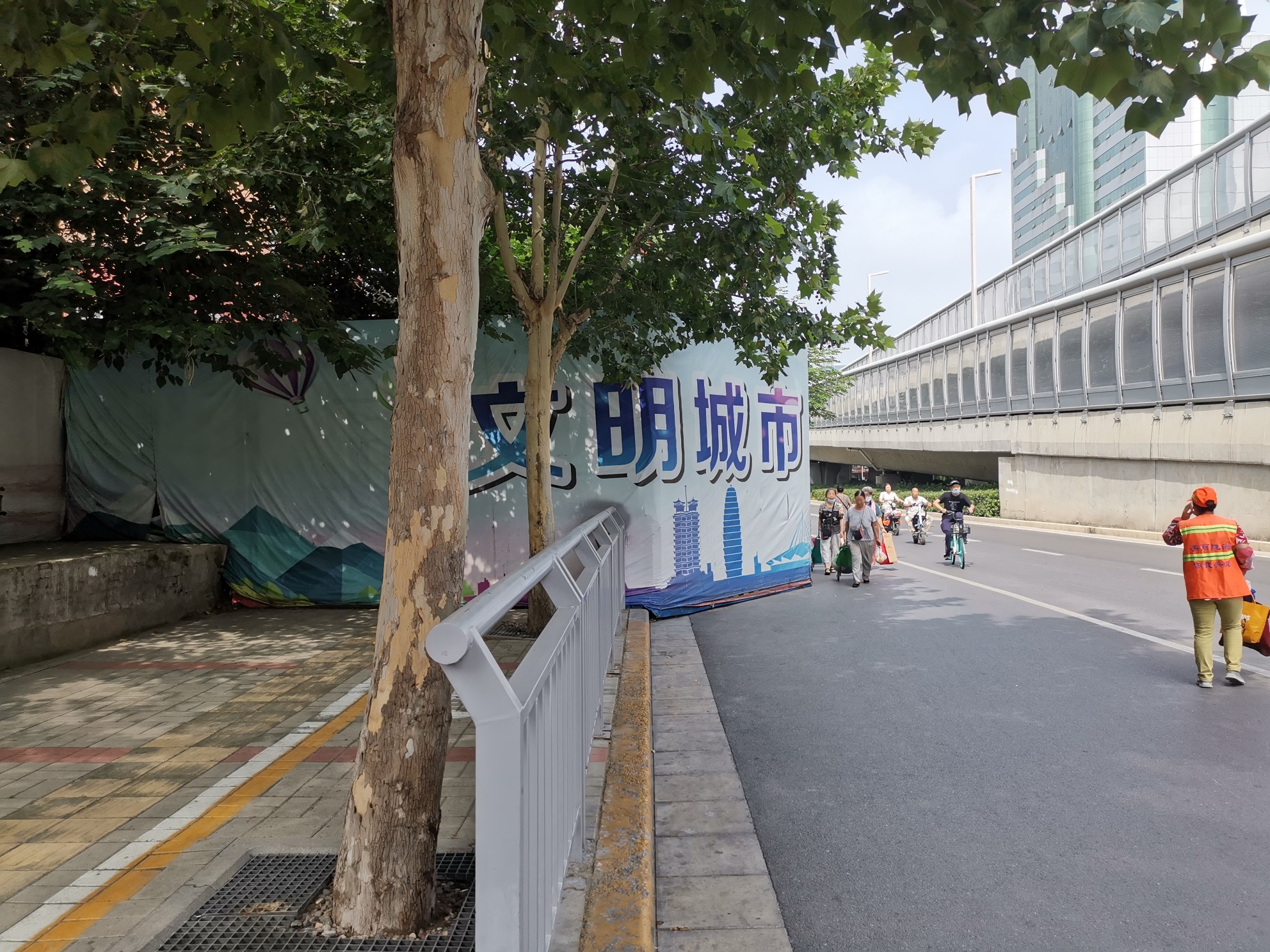7月31日上午,为了解现场情况是否有所进展,记者再次赶到现场。只见陇海路南侧围墙上向外凸出的围挡依旧挡在人行道和非机动车道上,几乎没有一丝变化。这块向外凸出长约10米,宽约8米的围挡上仍挂着“文明城市”的宣传广告,其西侧非机动车道上约10平方米的土路也仍盖着绿色的防尘网,现场没有任何将要拆除围挡和修复道路的痕迹,以及施工器械和人员。同时,与之前依旧相同的是,每当此处往来行人、电动车较多时,就会有行人或骑电动车的市民被挤进机动车道,与机动车抢道而行。