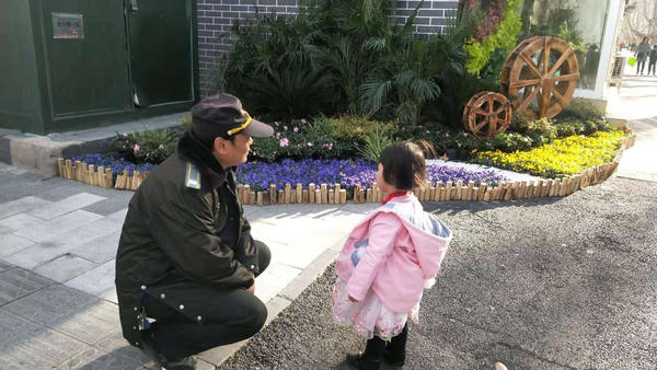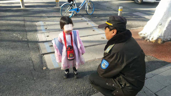 今天上午8时10分,郑州市金水区经八路办事处巡防队员孟庆斌、王艳州等人,巡逻到经六路与纬一路交叉口时,看到一名胸前挂着卡通小水壶女童站在路边,似乎要过马路,但其身旁却没有大人跟随。此时正值早交通高峰期,路上车流不息,队员王艳州担心女孩在马路上发生意外,忙上前拦下她。