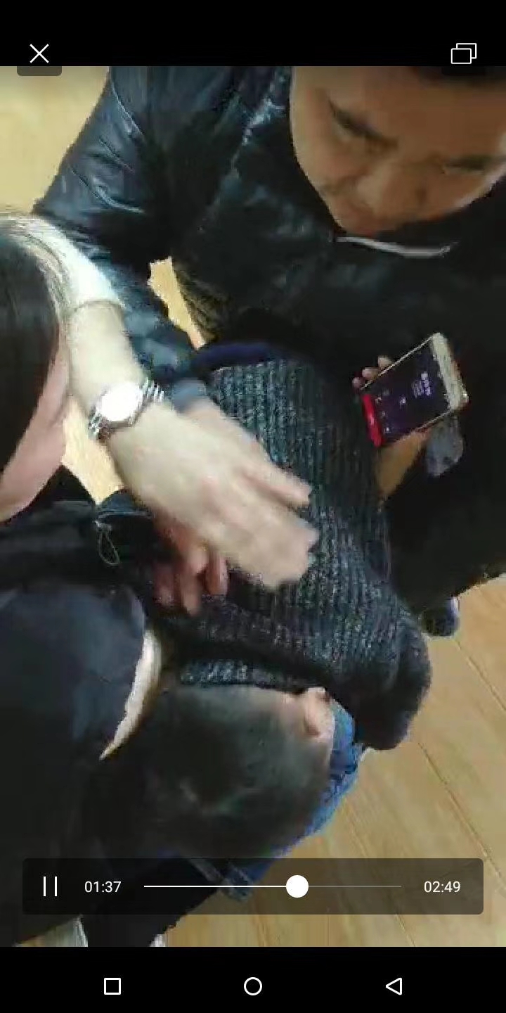 李中洲边询问情况边让旁人拨打120。孩子刚吃过饭就出现了这情况,李中洲怀疑是食道梗阻,赶紧进行急救。大概3分钟左右,孩子出现好转,面部红润,眼神转动。