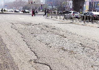 昨日,嵩山路陇海路交叉口北侧路东,快车道上出现了龟裂纹,有的地方还有曾经修补的痕迹。向北走,也有类似情况。