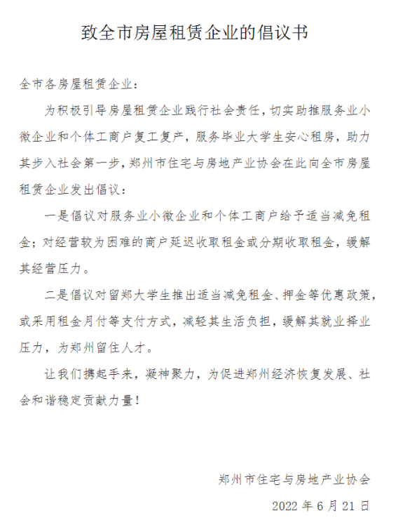 【大河财立方消息】6月21日,郑州市住宅与房地产业协会发布《致全市房屋租赁企业的倡议书》,助推服务业小微企业和个体工商户复工复产,服务毕业大学生安心租房。