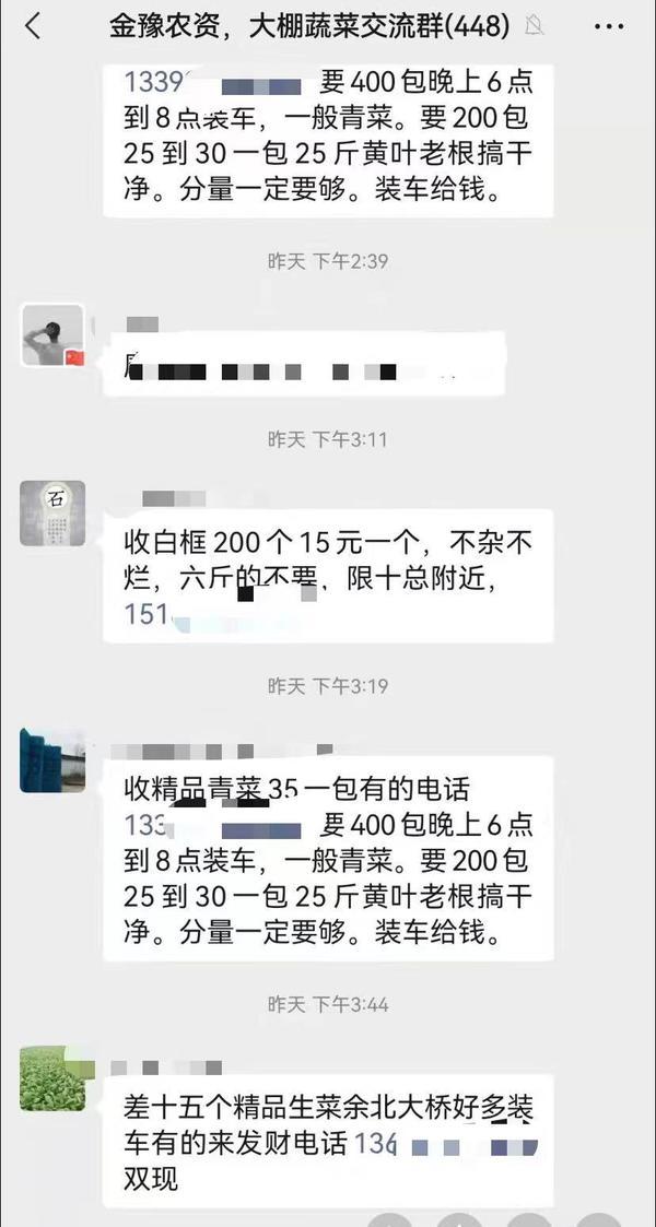 王磊手机里有不少蔬菜批发群,群里有来自全国多地的批发商和种植户。“批发商想要啥菜、要多少,会在群里喊价,我如果觉得价格合适,就会联系他。当然,如果哪个菜供应紧张,就会有人出价更高,出价更高的能拿到货。”