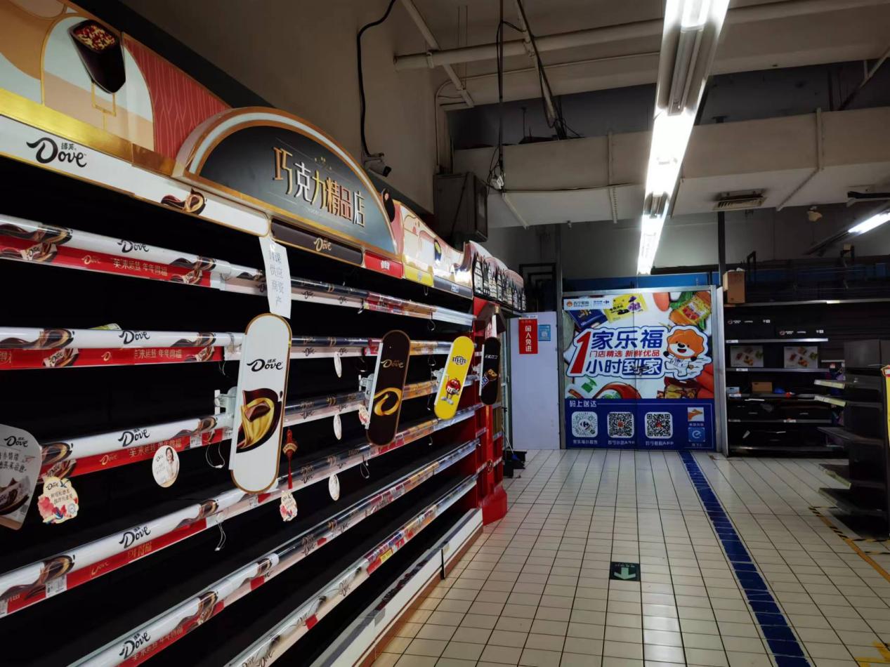 9月11日,记者在该超市看到,二楼百货区被围挡封闭、无任何照明。透过围挡,可见里面的货架已被清空。该超市三层的局部区域正在实施“清仓特卖”,仅留一个收银台做出入口。与坊间传闻一致,的确有洗化、日化、零食、调味品、消毒及冻肉冻鱼等品类的部分品牌,在做5折起促销,但商品数量相当有限,粗略估算不超过300个单品在参与活动。