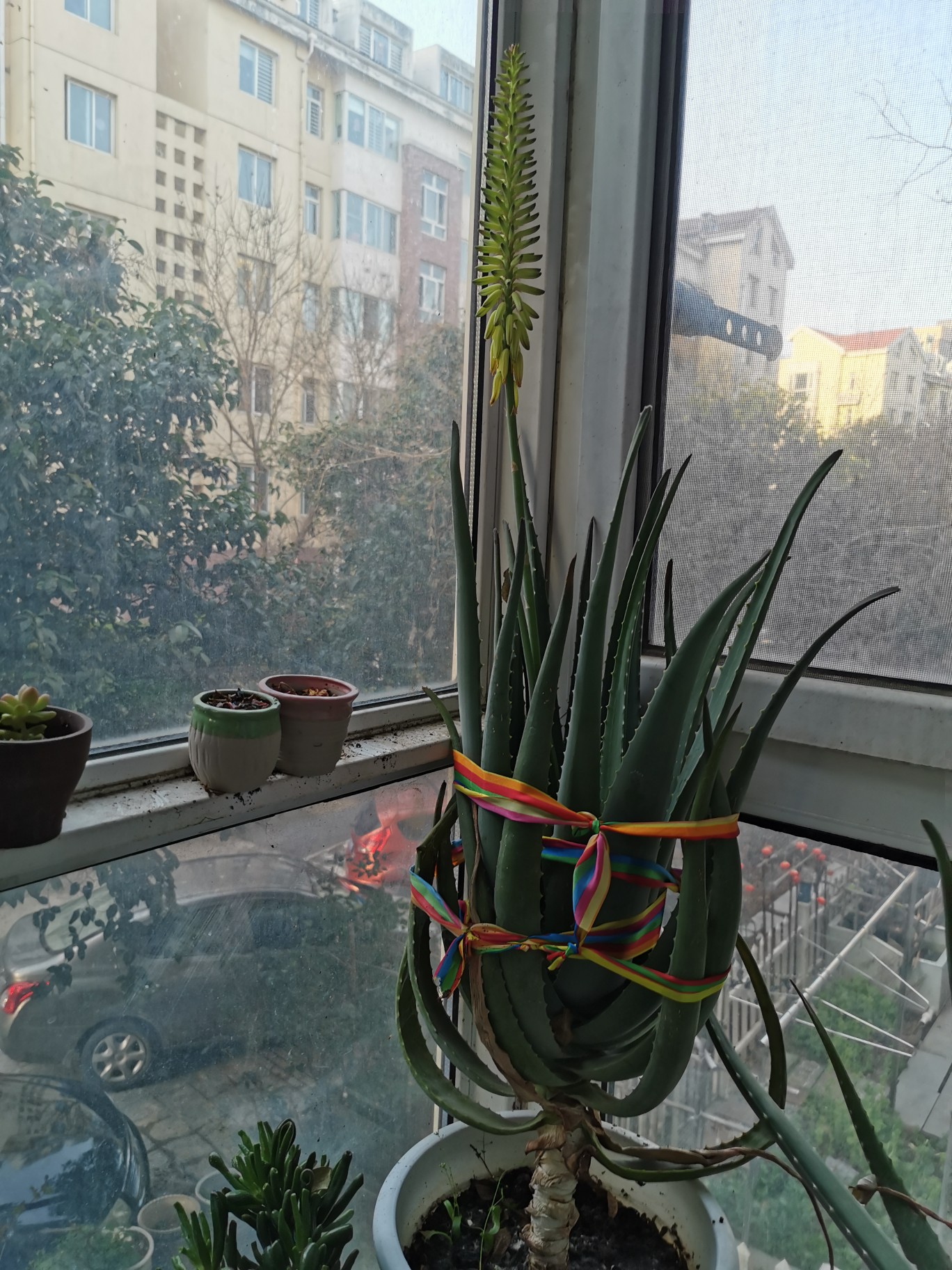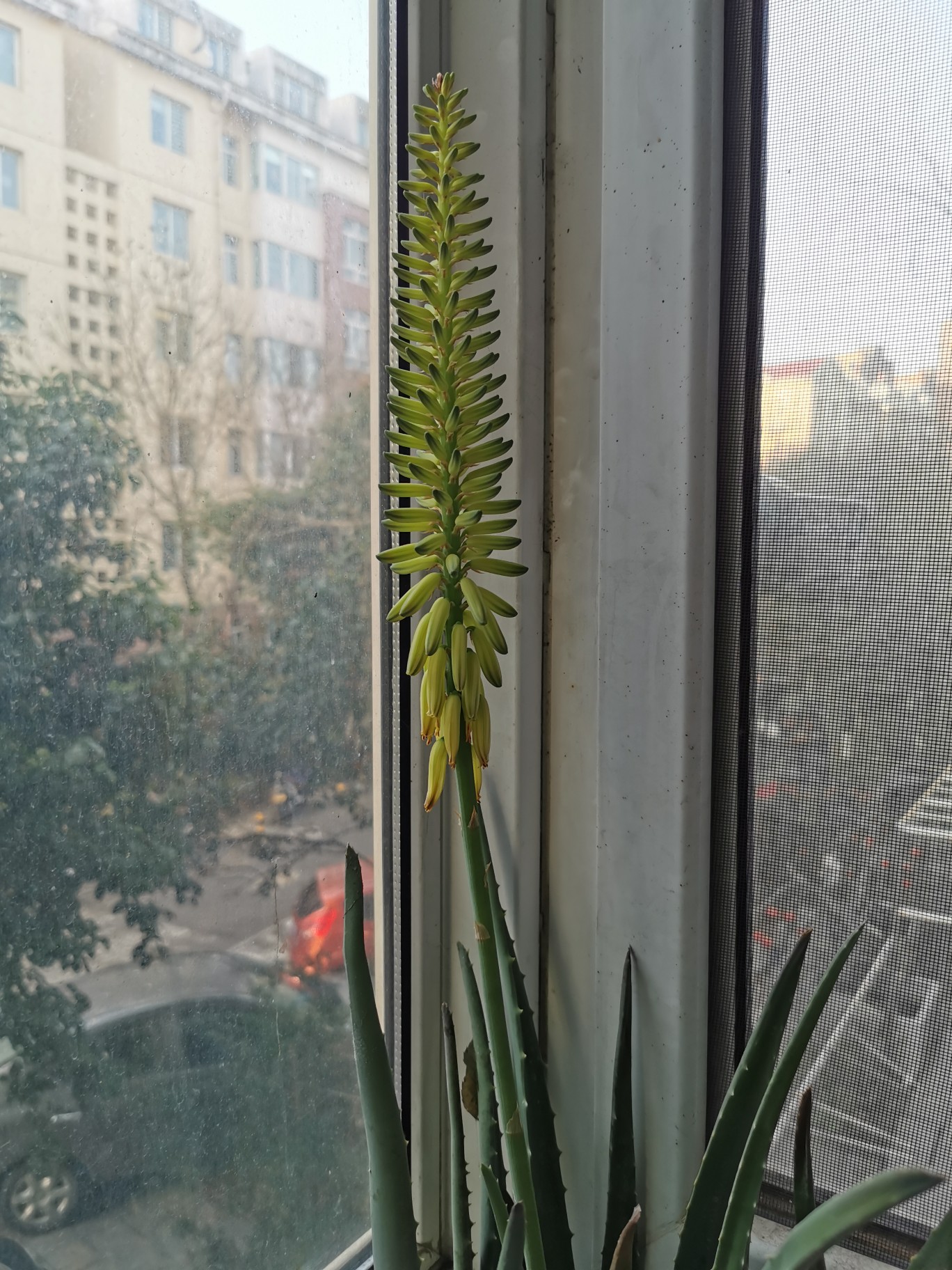 张女士家的开花芦荟,整棵高约50厘米,它栽种在靠窗阳台花盆里,其旁边,是多棵芦荟幼苗及生长多年的多肉、月季等花草。开花芦荟中央位置,向上笔直地吐出一根长条,它长约30厘米,由长条中年部位循上,吐出数棵状如大葵花籽的淡黄色小花朵。“2月底一天,无意中发现这棵芦荟开花了,一家人非常高兴。”张女士说,这棵芦荟他们栽种了足足11个年头,一年四季粗放型管养,想起来了给它施肥、浇些水;夏天的时候,天气炎热,植物生长需要大量水分,好几次隔个多日才想起浇水,整个芦荟都发蔫了。不过其生命力顽强,浇过水后,很快又是葱茏。