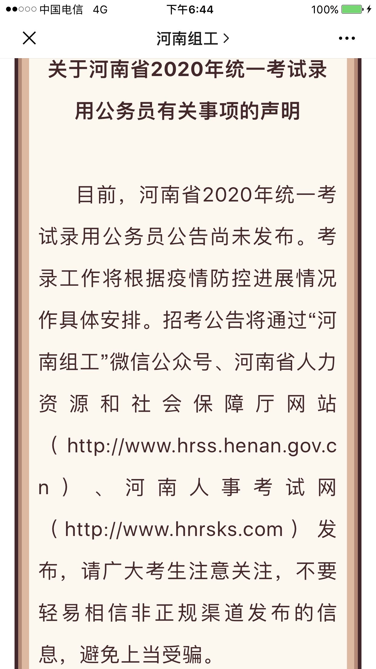 《声明》表示,目前,河南省2020年统一考试录用公务员公告尚未发布。考录工作将根据疫情防控进展情况作具体安排。招考公告将通过“河南组工”微信公众号、河南省人力资源和社会保障厅网站(http://www.hrss.henan.gov.cn)、河南人事考试网(http://www.hnrsks.com)发布,请广大考生注意关注,不要轻易相信非正规渠道发布的信息,避免上当受骗。