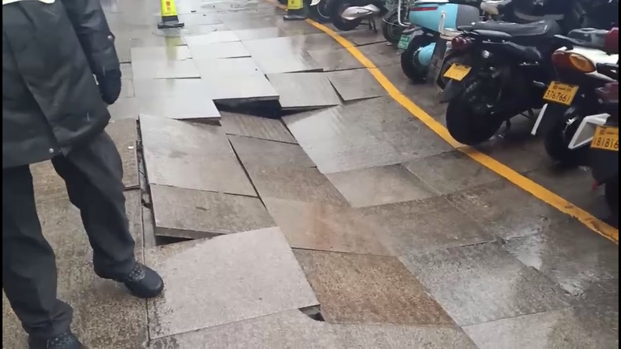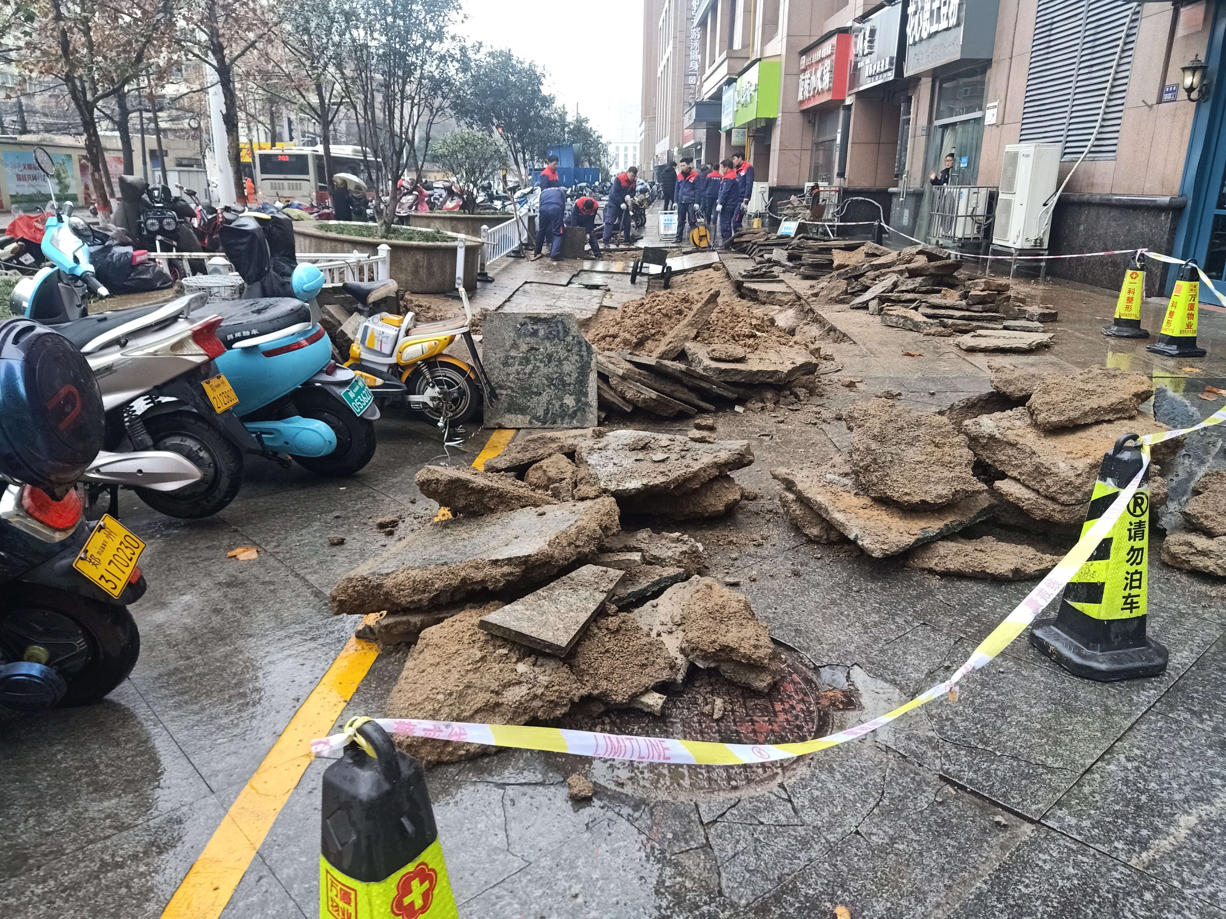 抢修人员赶到现场后,将塌陷区域的地板砖全部掀开,以便查找塌陷原因。目前,抢修人员正在现场施工。