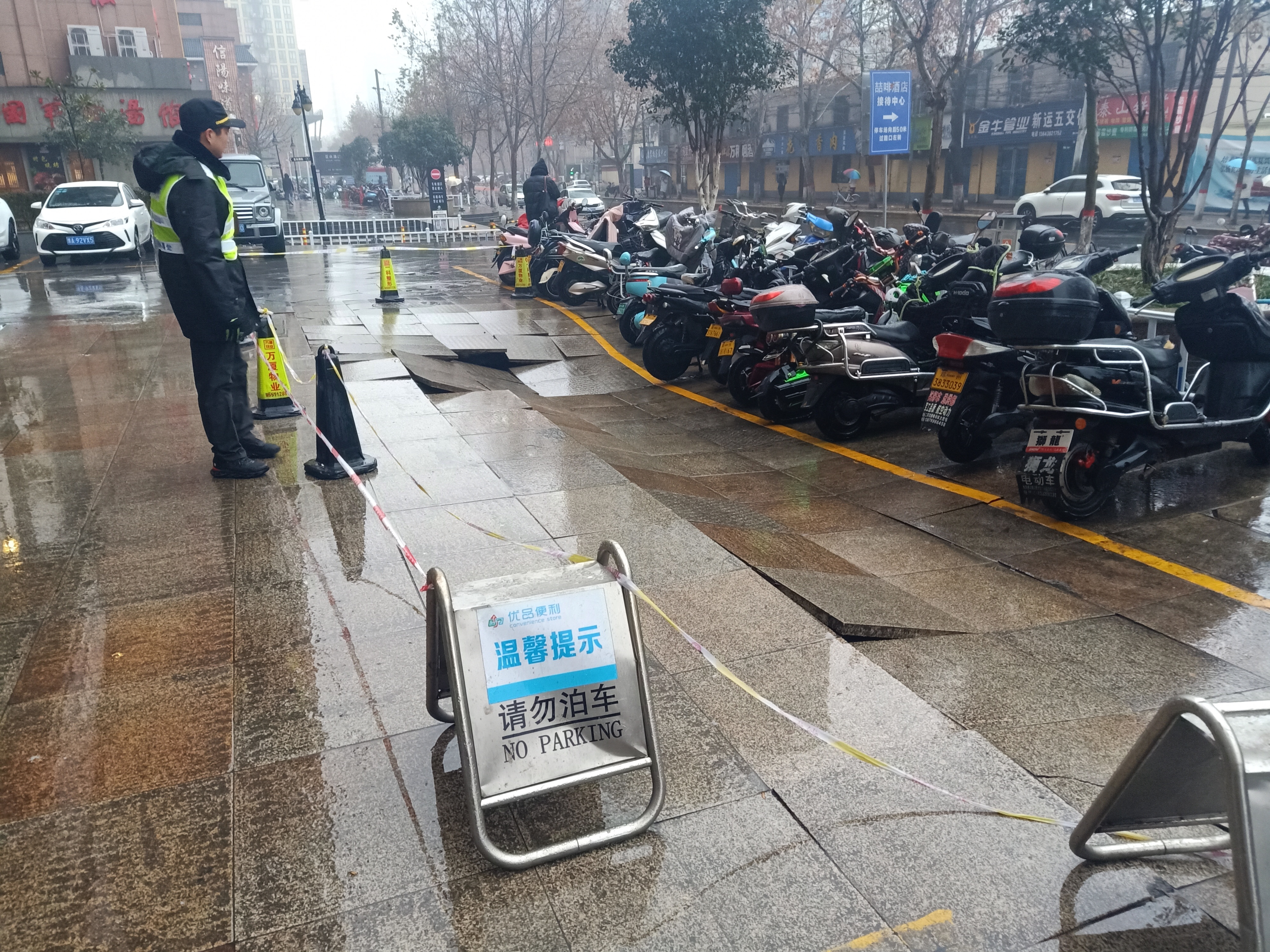 1月7日上午,郑州市红旗路与姚砦路交叉口南侧的一个广场上,路面突然发生塌陷,塌陷面积约8平方米。在广场上巡逻的金水区丰产路办事处巡防队员发生后,立即在塌陷周边拉上警戒线,以免车辆和行人坠入塌坑中。