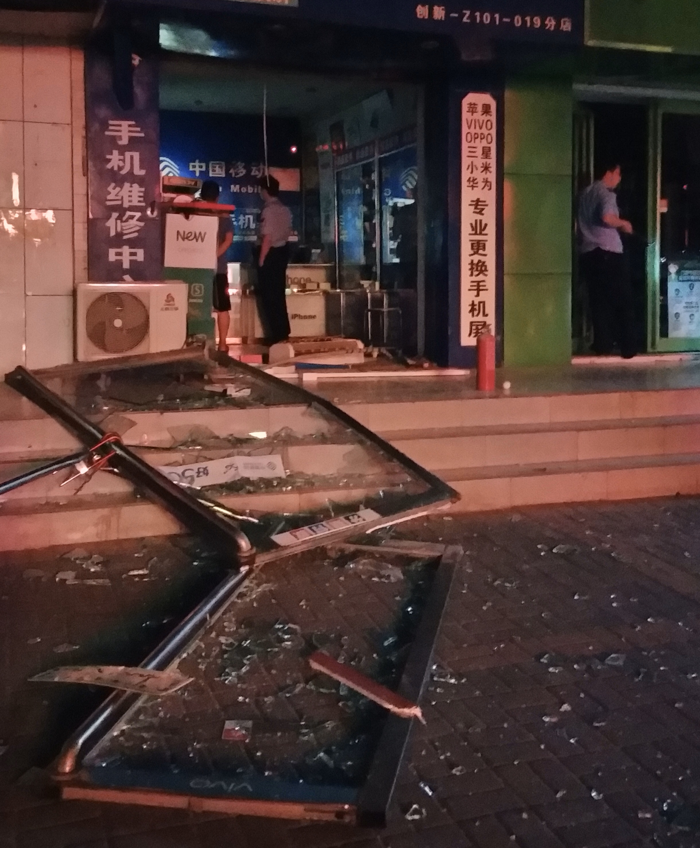 6月7日晚上,在郑州市桐柏路与十里铺路交叉口附近,一家手机维修店突然发生爆炸,两扇玻璃门被炸飞,碎玻璃四处飞溅,所幸没有人员受伤。