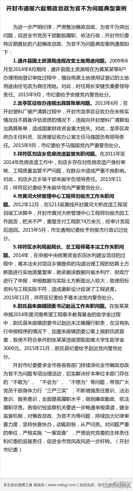 #清风播报#【开封市通报六起懒政怠政为官不为问题典型案例】河南省纪委监察厅官方微博@清风中原 权威发布,为进一步严明纪律,严肃整治懒政怠政、为官不为突出问题,促进全市党员干部勤勉履职、依法行政,开封市纪委将近期查处的六起懒政怠政、为官不为问题。