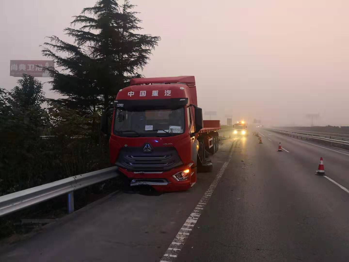接报后,支队值班事故大队长党国军赶往现场处置,在事故现场,看到一辆红色的鲁H58***(临)号半挂车骑在路侧护栏上,从出口匝道直至停车位置损坏十几根护栏。据驾驶员庞某叙述,他和他爱人一起11日在山东济宁购买了这辆解放半挂车,提车后天色已晚,车上就他一个驾驶员,走走停停,期间还在郑州北服务区休息,但内心抑制不住高兴之情,有点兴奋睡不着,就起身继续赶路,行至连霍高速公路北半幅偃师下道口附近时,有点迷糊,感觉就打了个盹,“咣当”一声就撞护栏了,万幸的是,造成自车损坏无人受伤。
