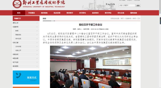 4月15日,郑州工业应用技术学院在行政管理中心六楼会议室召开干部工作会议,宣布中共河南省委组织部关于郑州工业应用技术学院主要领导的任免决定。省委高校工委专职委员高治军、组织干部处处长冯轩友出席会议,中原华信商贸集团总裁、学校副理事长徐朝阳,河南华信阳光教育科技集团总经理闫兵、学校全体校领导及各单位负责人参加会议。会议由中原华信集团总裁徐朝阳主持。