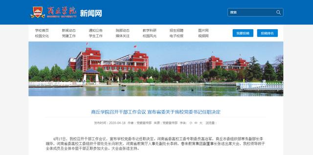 4月17日,商丘学院召开干部工作会议,宣布学校党委书记任职决定。河南省委高校工委专职委员高治军,商丘市委组织部常务副部长李瑞华,河南省委高校工委组织干部处处长冯轩友,河南省教育厅人事处副处长李班,春来教育集团副董事长张洁出席大会,学校领导班子全体成员及全体中层干部正职参加大会。大会由张洁主持。