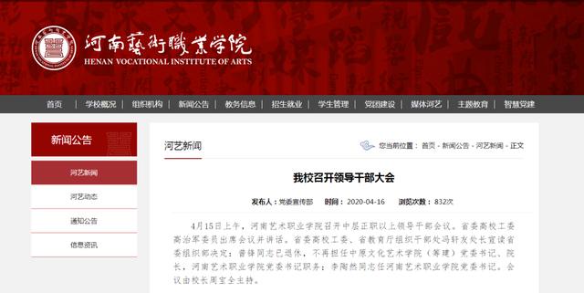 4月15日上午,河南艺术职业学院召开中层正职以上领导干部会议。省委高校工委高治军委员出席会议并讲话。省委高校工委、省教育厅组织干部处冯轩友处长宣读省委组织部决定:普锋同志已退休,不再担任中原文化艺术学院(筹建)党委书记、院长,河南艺术职业学院党委书记职务;李陶然同志任河南艺术职业学院党委书记。会议由校长周宝全主持。