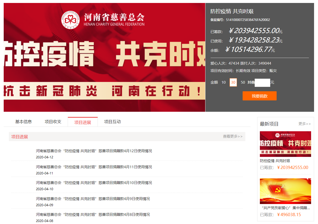 围绕当前疫情防控工作大局,省慈善总会于1月26日紧急启动“防控疫情 共克时艰”慈善项目,充分发挥自身优势,通过开展线上线下公开募捐,呼吁社会各界积极行动起来,助力打赢疫情防控阻击战,得到了社会各界的积极响应。该项目的善款收入和支出每天公示,详细情况可以随时登录河南慈善网查看。