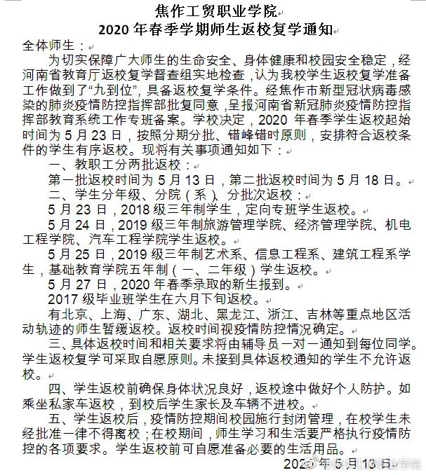 1.第一批返校学生为本科生和部分毕业班学生,返校报到时间为2020年5月20~21日。目前在省内居住的来华留学生,与第一批学生同步返校。