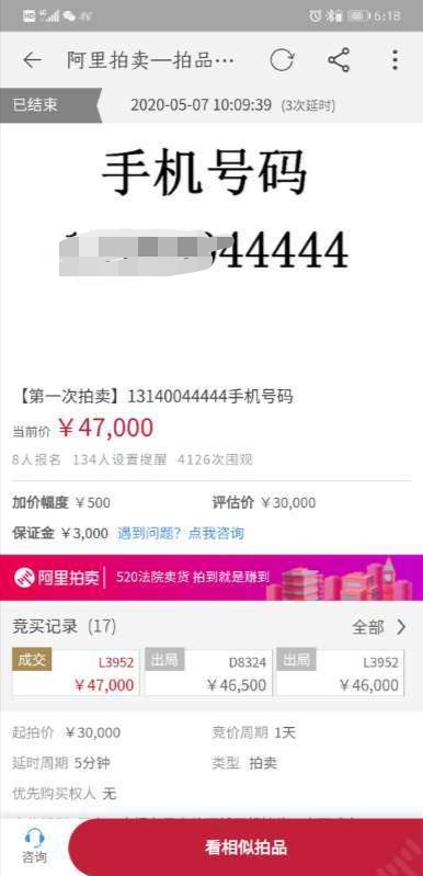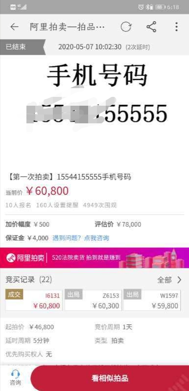 前不久,河南杞县人民法院拍出了全县首个 “天价”手机号,首次拍卖,近百次竞拍,“天价”手机号最终以8.05万元的价格成交。5月7日,杞县人民法院再次采用网拍手机号的方式,又一次顺利拍卖了3个5连号的手机号,首次拍卖均溢价成交,共拍得案款16.29万元。