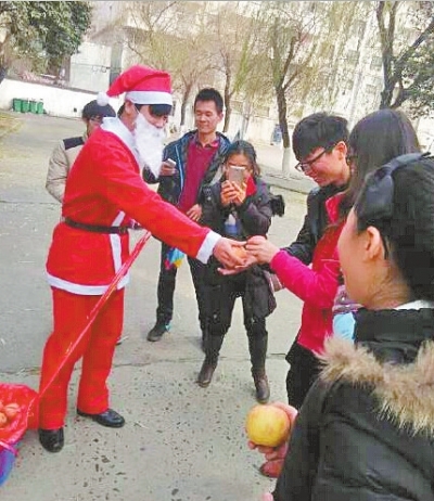 洛阳高校老师扮圣诞老人 平安夜为学生发苹果