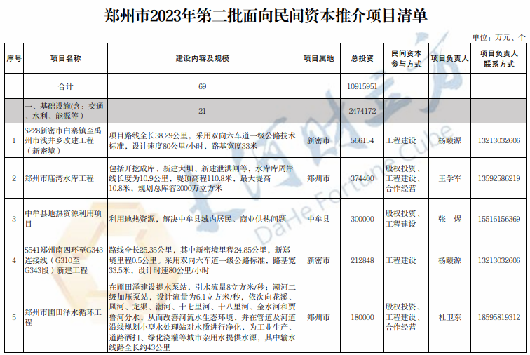 【大河财立方消息】5月25日消息,郑州市发展改革委近日公布2023年第二批面向民间资本推介项目清单。