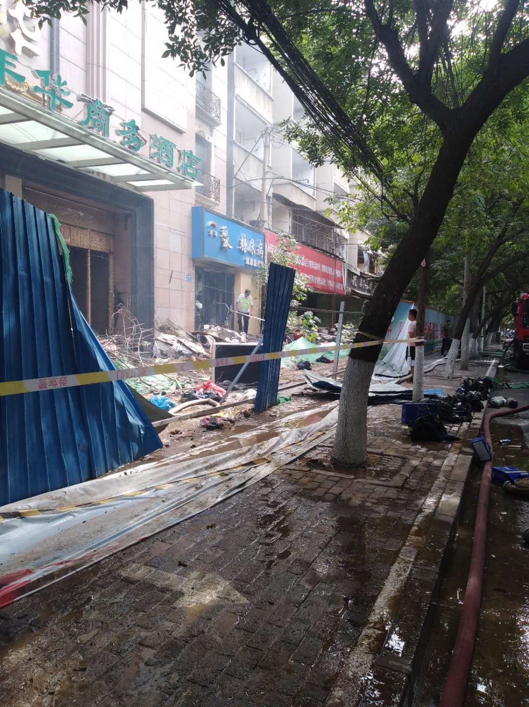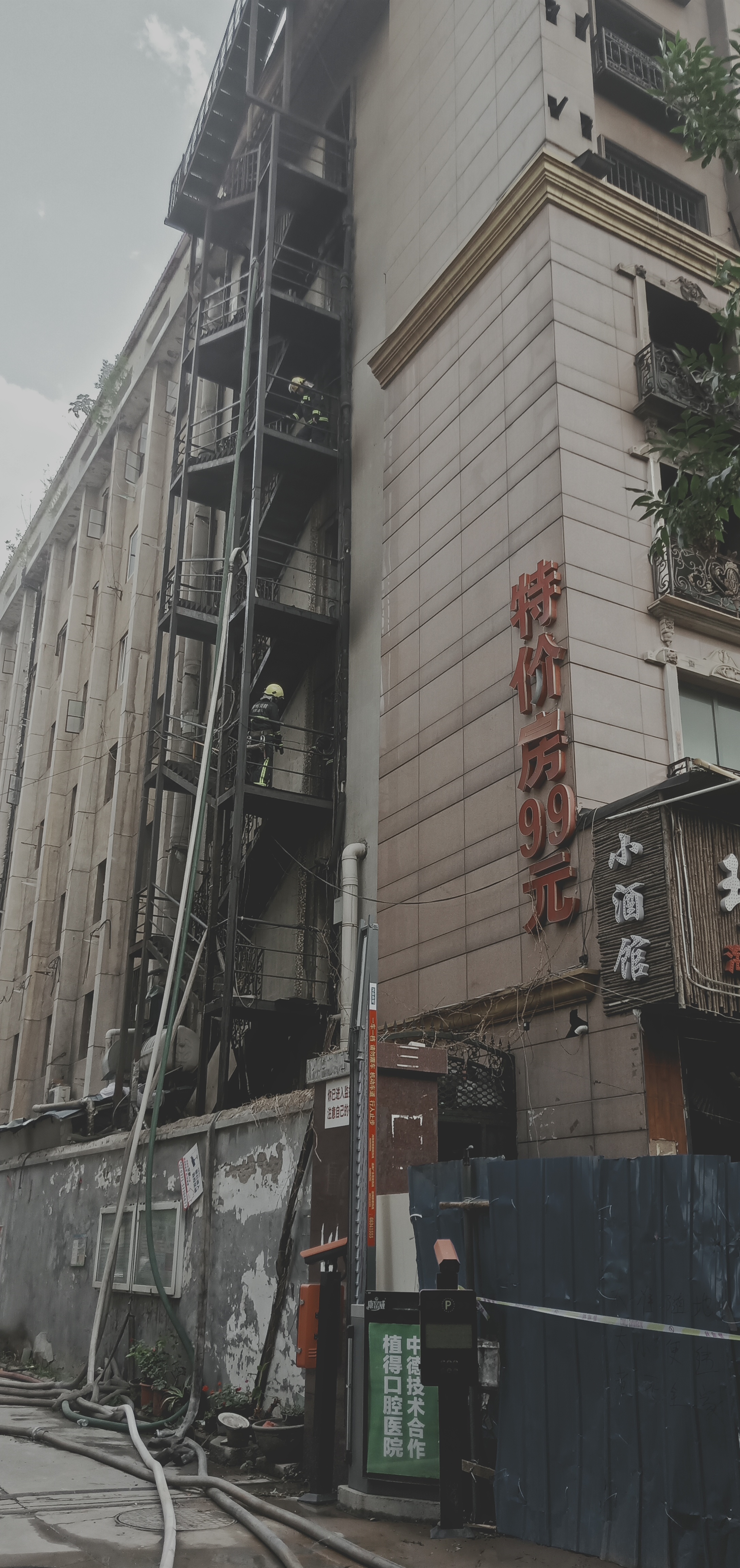 下午4点半,记者在现场看到,火灾现场被拉起了警戒线,现场大火已被扑灭,而失火的拆迁房外侧的铁制楼梯均被熏得漆黑。一楼的小酒馆也有过火的痕迹。几名消防队员仍在现场清理残火。