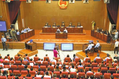 随着一声清脆的法槌声响起,审判长张立勇宣布开庭。此次的庭审格局进行了大变革,被告席的位置从原来审判席对面,被偏移到紧靠其辩护席旁边。原来庭审的“四方格”格局,现在变成了“三角形”格局,意在保障被告人权利,使控辩双方在法庭上地位平等。