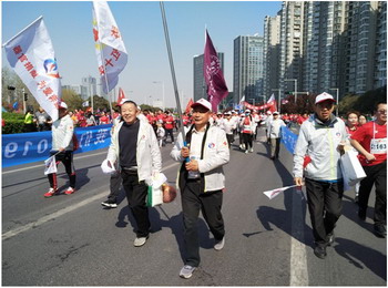 郑开国际马拉松五公里小马拉松赛在郑州CBD风景如画的如意湖畔,在参赛前,红十字方队队员为群众宣讲人体器官捐献知识,向大家传递红十字会“人道、博爱、奉献”的红十字精神。在参赛过程中,队员们挥舞着带有“人体器官捐献”和“红十字”会徽的旗帜,为器官捐献者传递生命的大爱奔跑呐喊,在跑道沿线,许多群众驻足观望,欢呼鼓掌,得到了积极的响应。