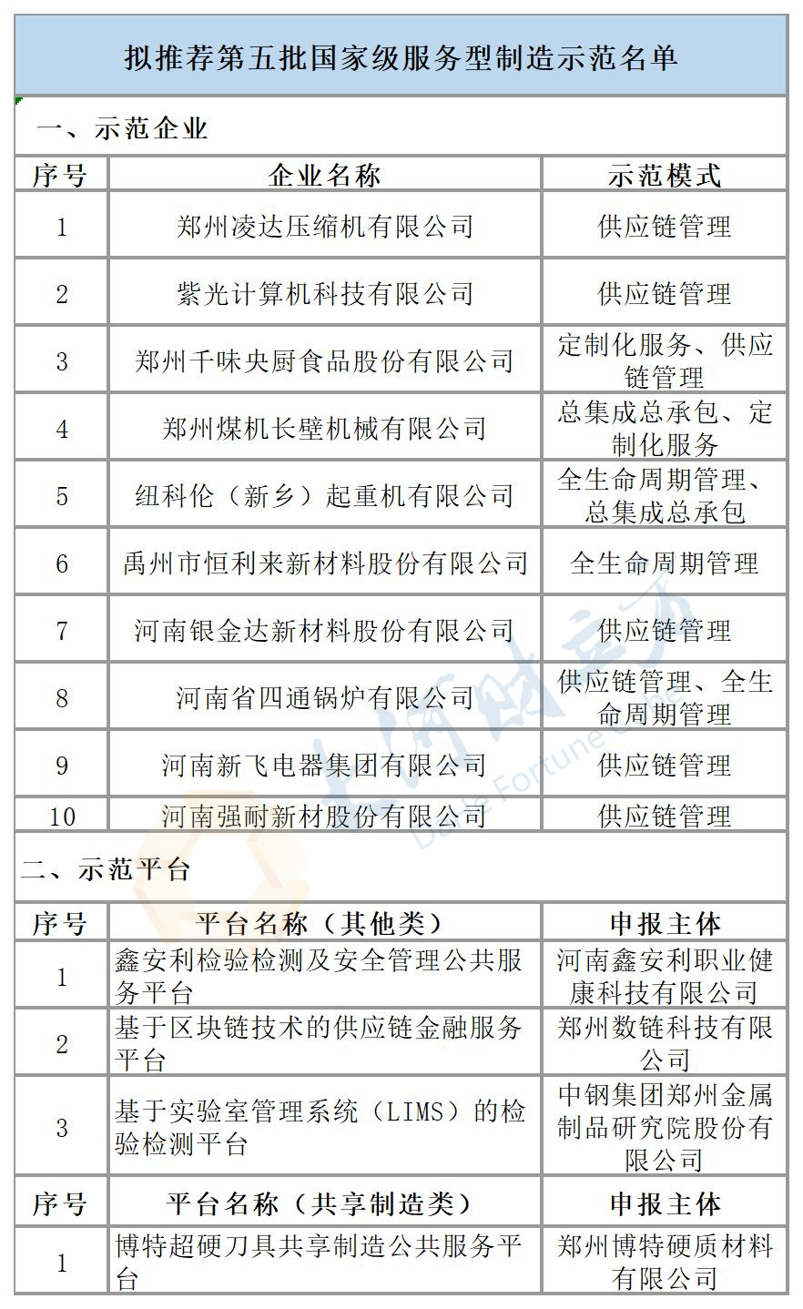 河南省拟推荐第五批国家级服务型制造示范名单公示
