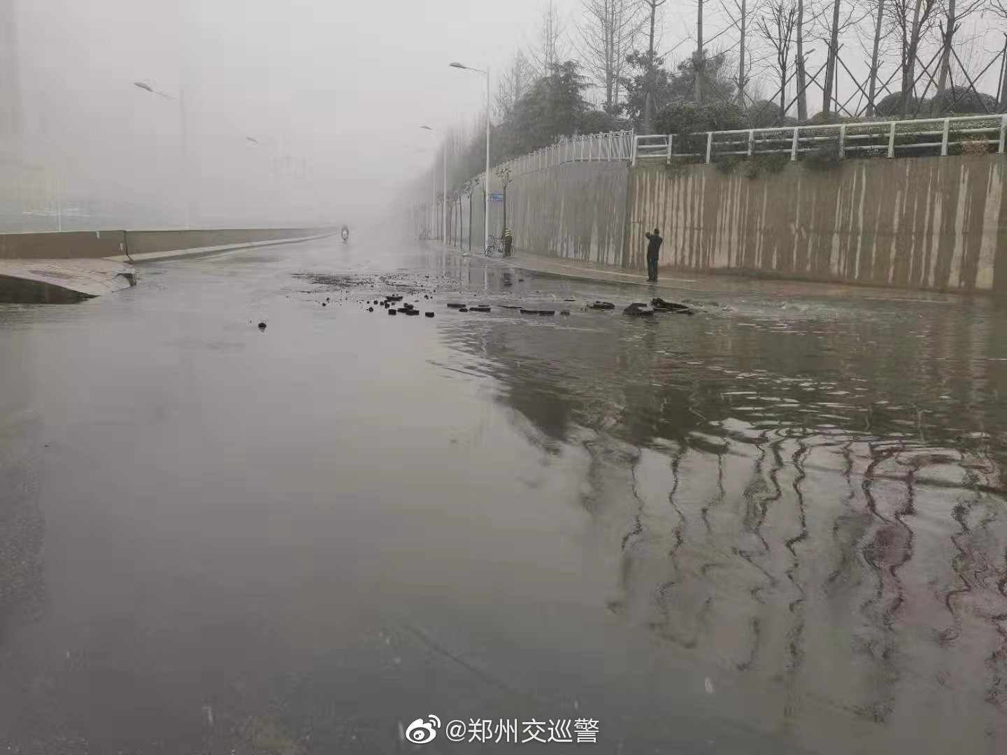 1月5日上午9时,郑州交警提醒,西三环金水西路东南角,因地势低洼引起路面和陇海铁路西三环下穿隧道东侧积水,望广大车友提前绕行。