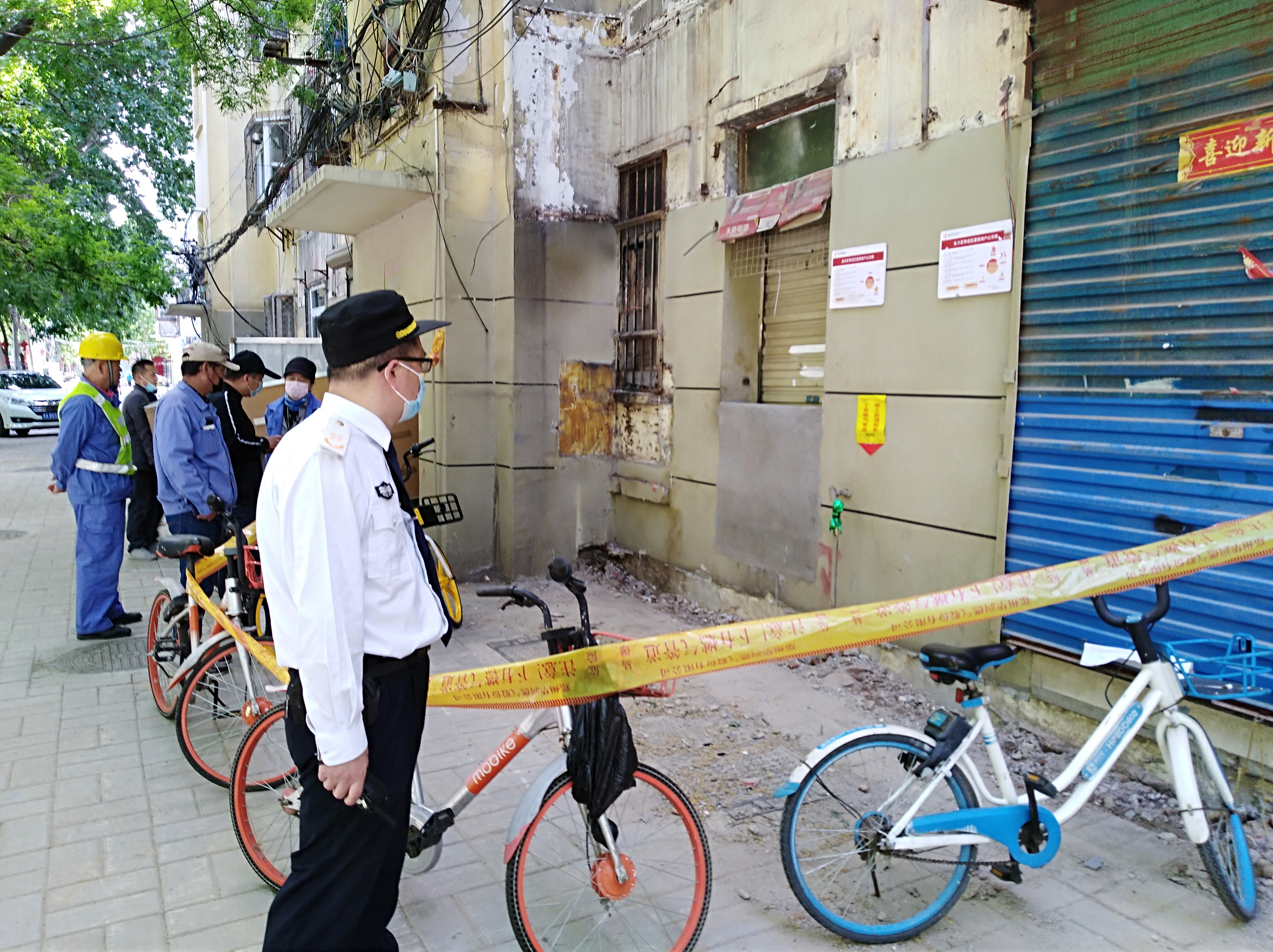 为避免引发大的事故,姚建庭赶紧跑到远处,打电话给文联社区主任王卫华。队员张永生、陶恩柱则赶紧从附近搬来几辆共享单车,挡在管道前面,不让行人造近,提醒大家不要吸烟。随后,姚建庭又从巡防室取来了警戒带,将现场围起来。