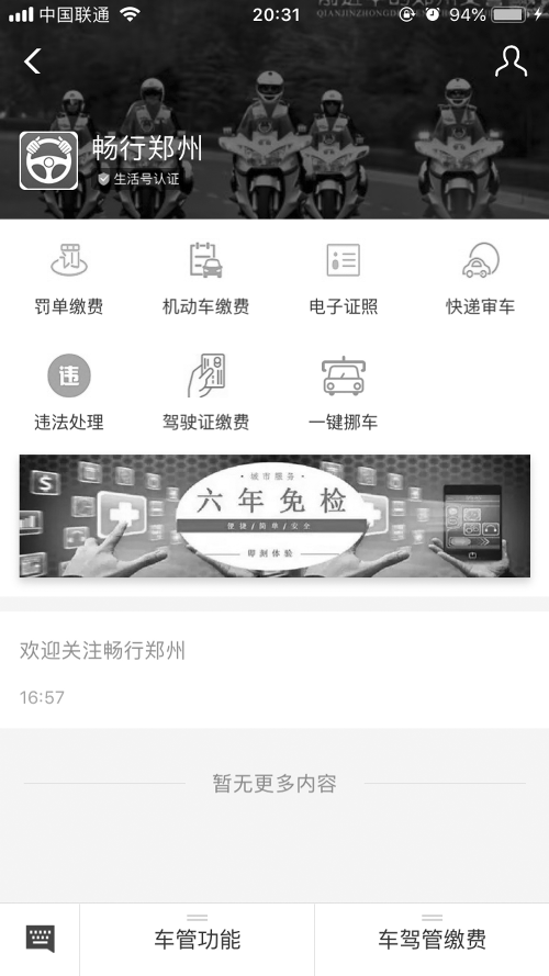 除此之外,郑州车主还能在支付宝上处理交通违法和罚款缴纳,享受新车六年免检、一键挪车等服务。