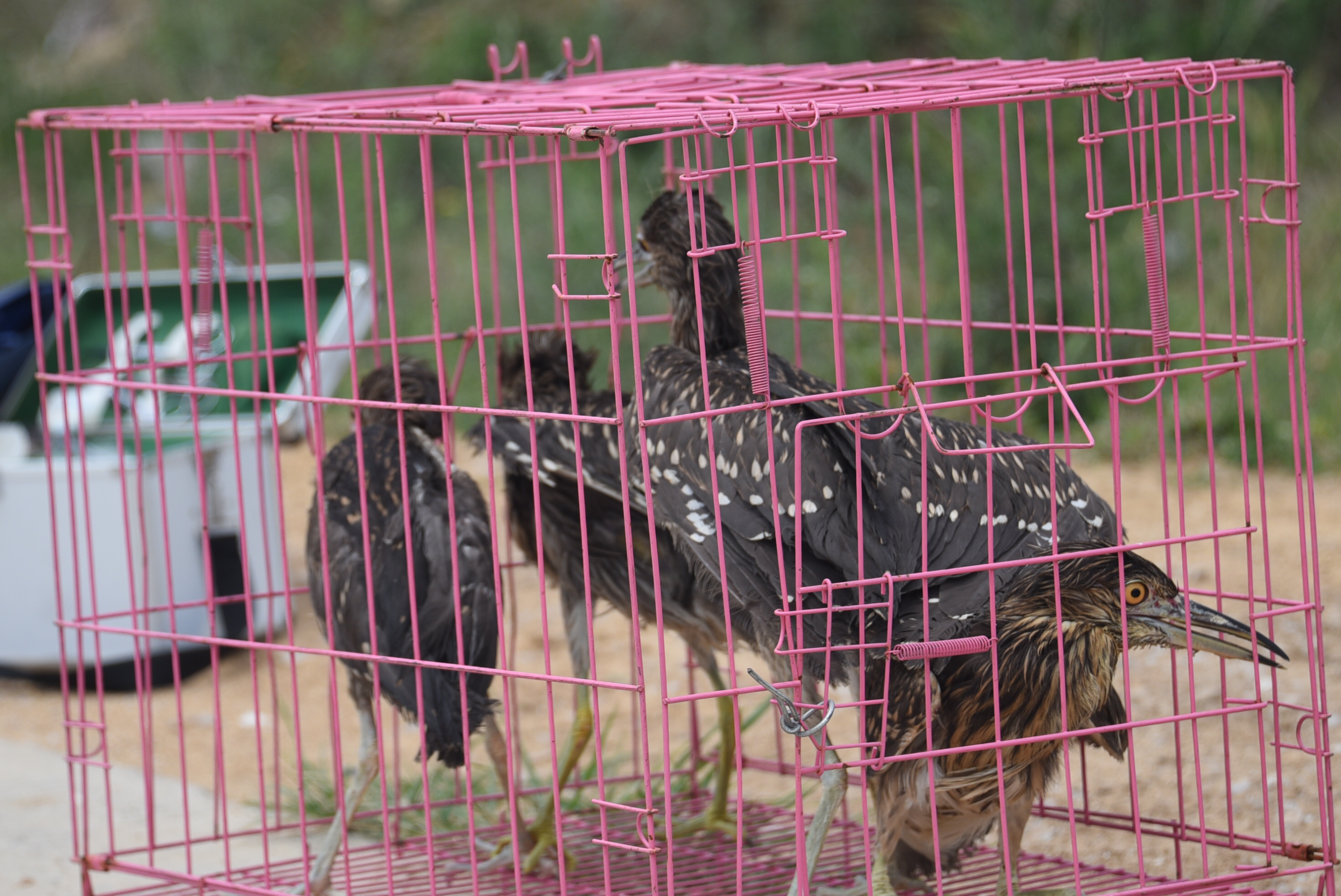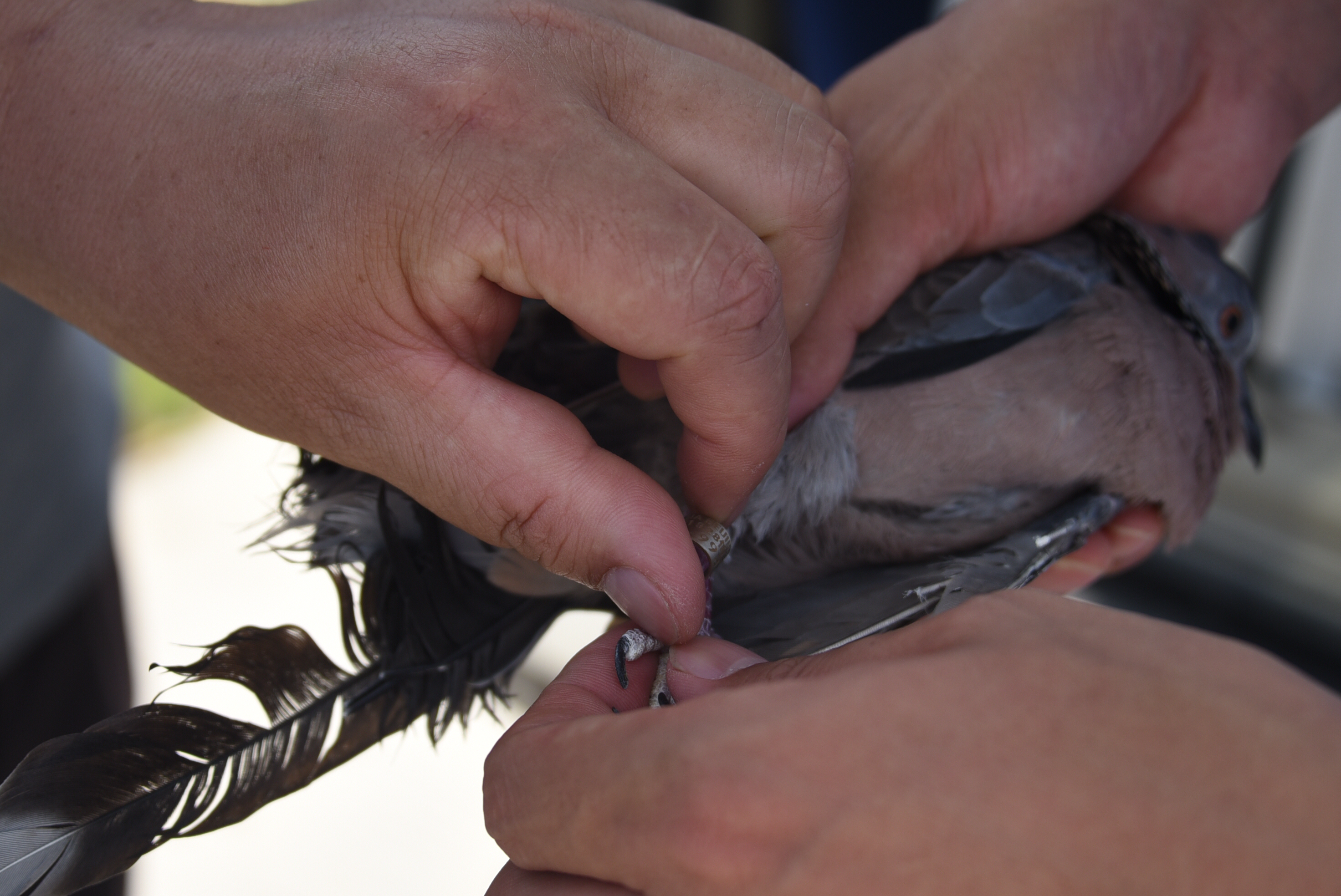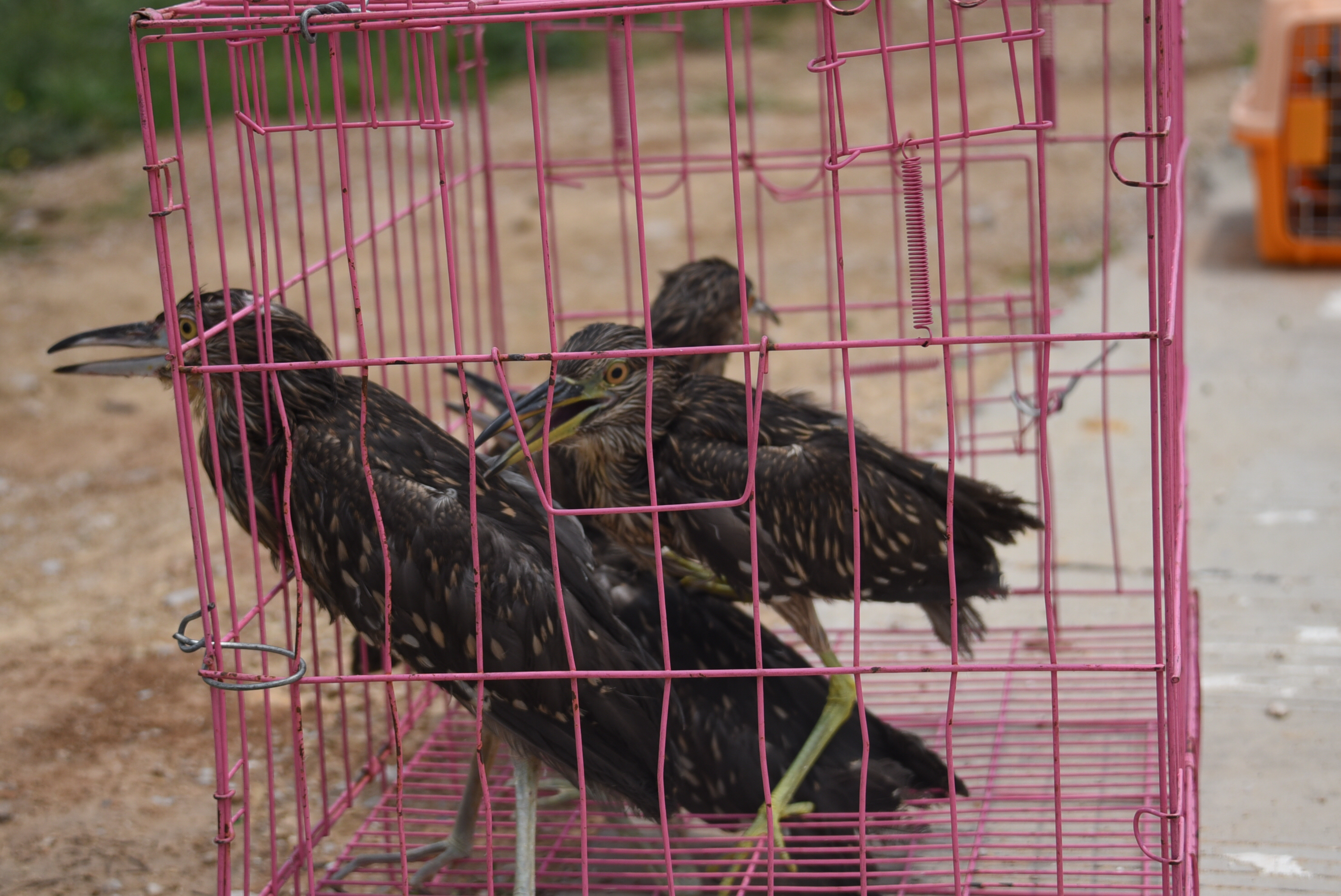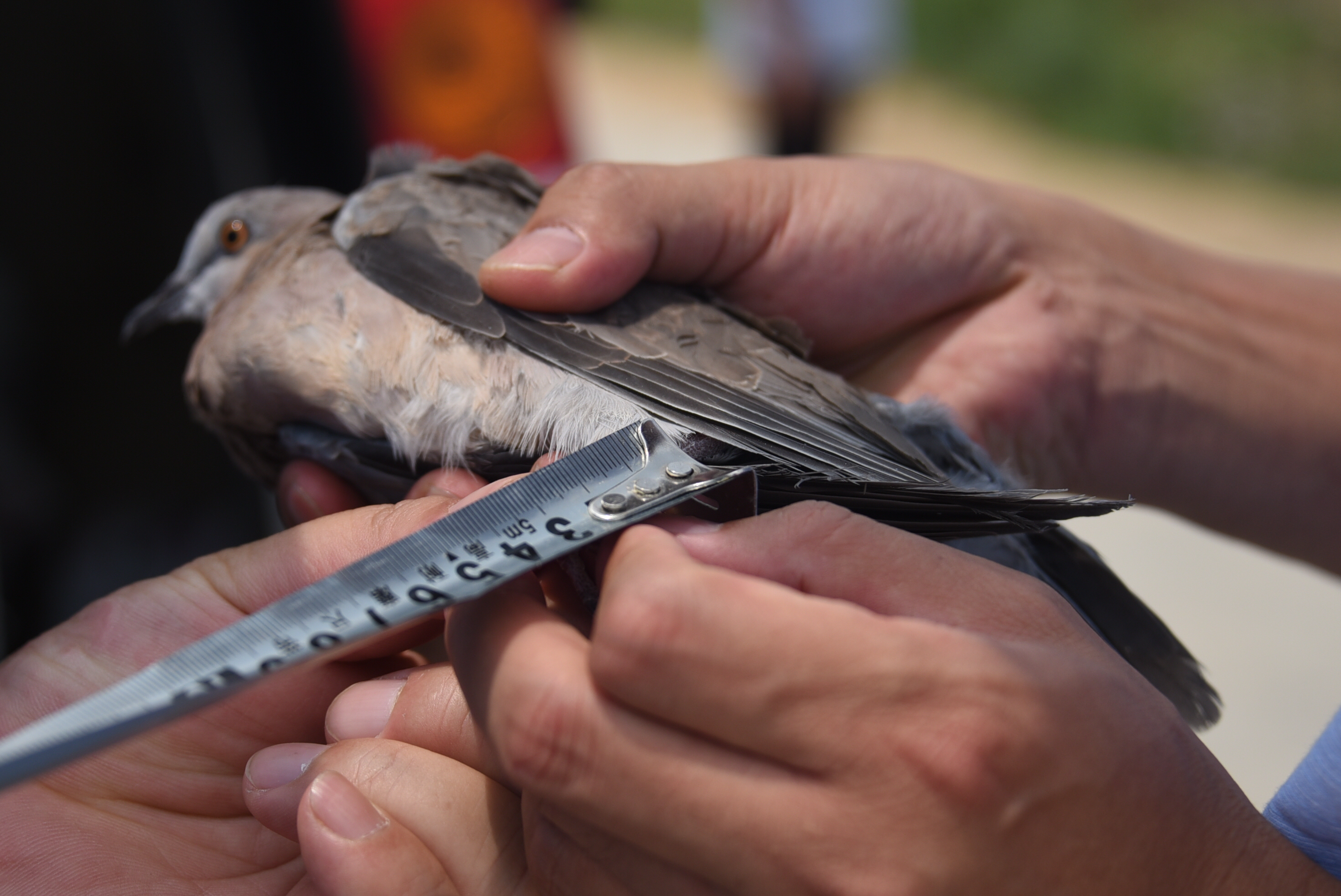 一只已经安装环志的斑鸠鸠显得急不可待,突然从工作人员手里挣脱,飞了出去,但它并没有飞远,而是落在不远处的草丛里,回头看了看大家,好一会才飞走。而其它的鸟儿在笼子里也开始躁动不安,跃跃欲试。