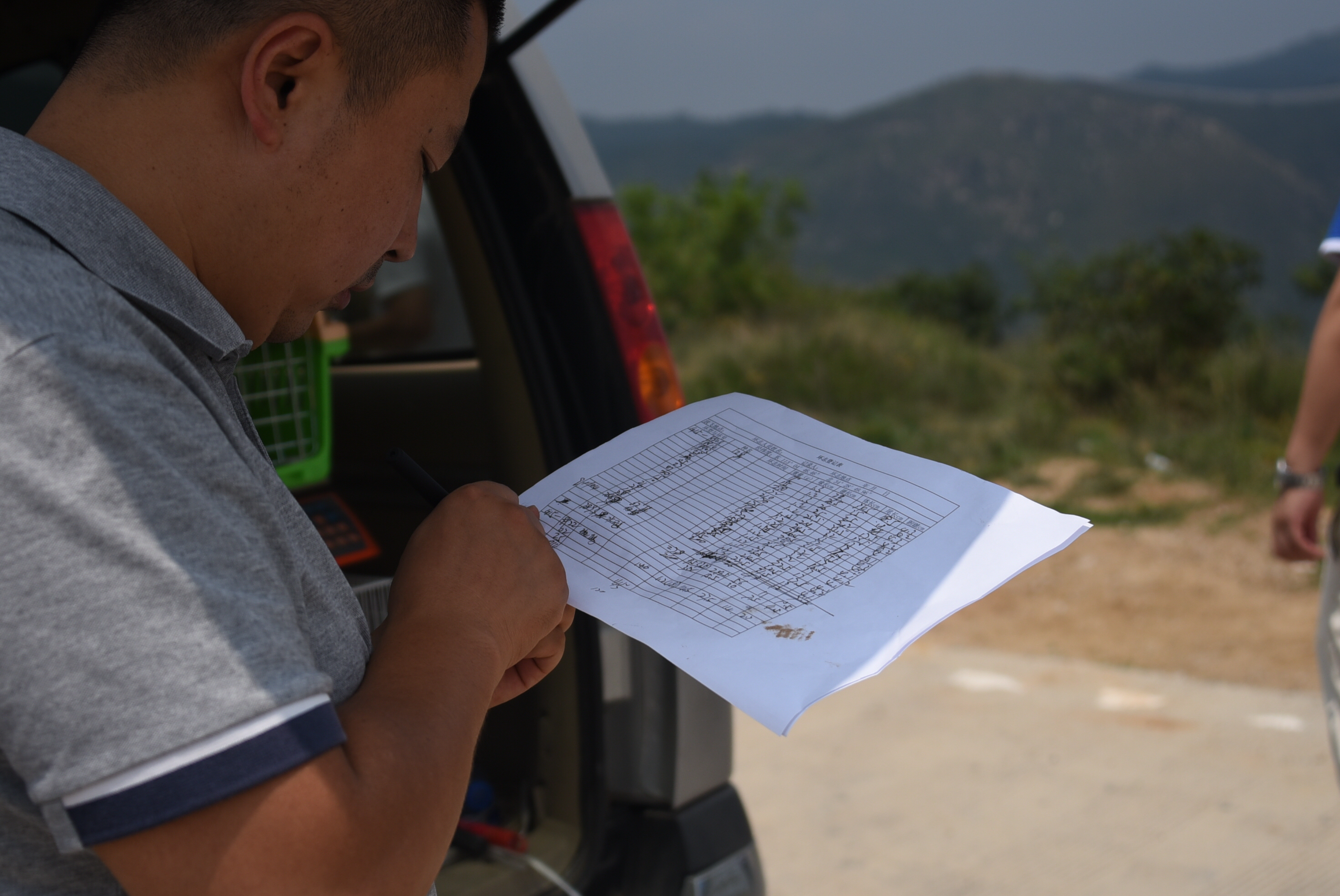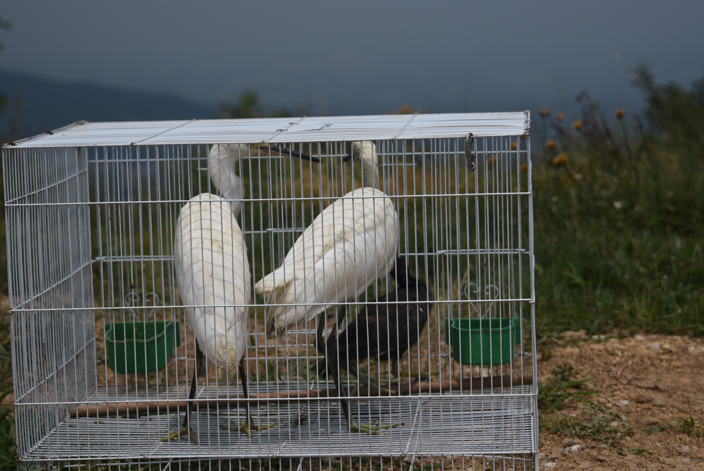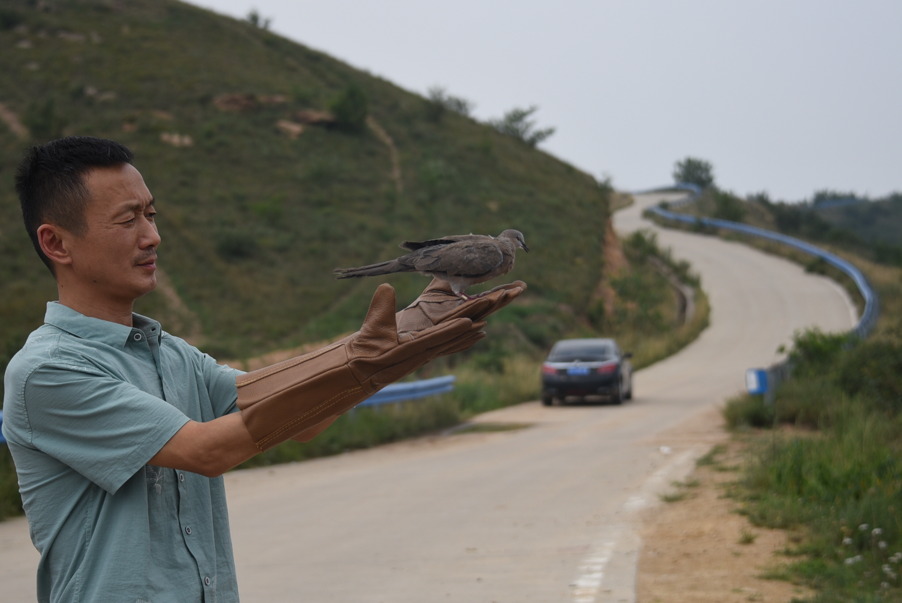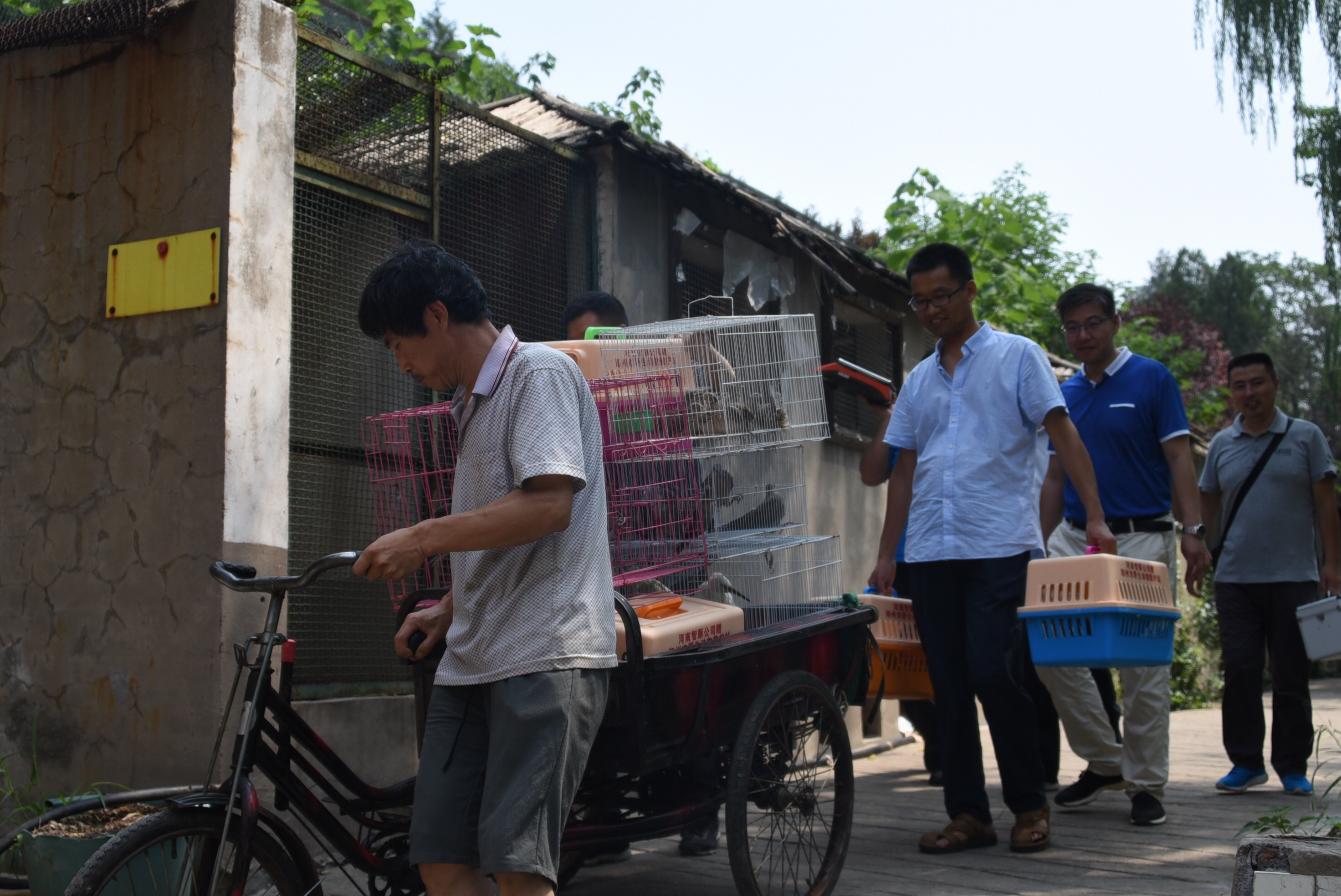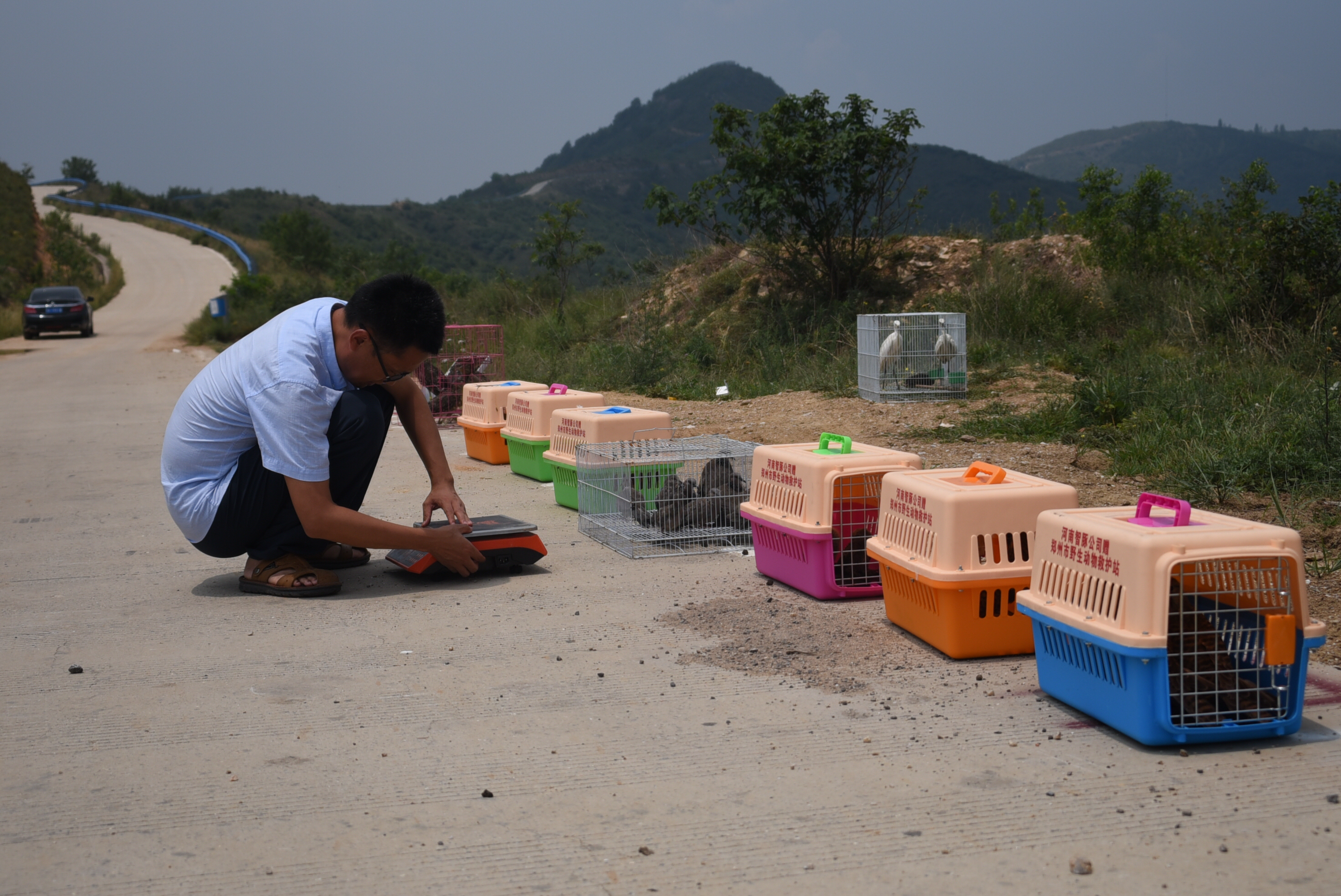 下午2点左右,车队来到了新郑市具茨山。在具茨山的山顶,救护人员将10个装着鸟儿的救护笼子搬下车。董朝伟站长再次对这些即将放飞的鸟儿进行了检查,省野生动物救护中心救护科的工作人员又在几只斑鸠的腿部,加装了一个环志,使这批被救护的鸟安装环志总数达到了38个。