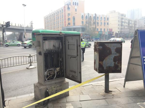 紫荆山路商城路交叉口西北角敞开箱门的配电箱