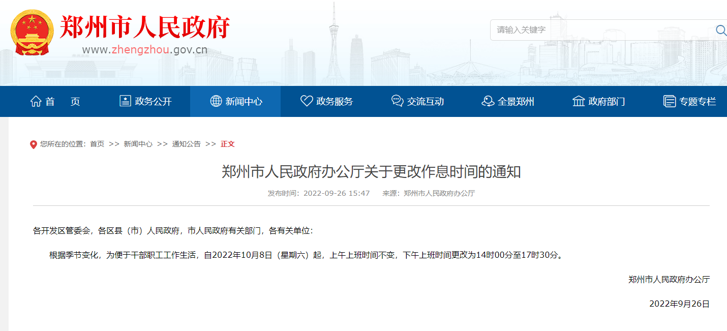 【大河财立方消息】9月27日消息,郑州市人民政府办公厅发布关于更改作息时间的通知称,根据季节变化,为便于干部职工工作生活,自2022年10月8日(星期六)起,上午上班时间不变,下午上班时间更改为14时00分至17时30分。
